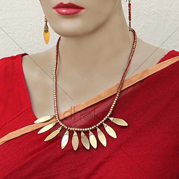 Celebrate the timeless beauty of tribal artistry with the Dhokra Golden Lily Avanti Set. This exquisite handcrafted jewellery set is adorned with red-golden pellet thread work and delicate leaf-drop motifs, giving it a majestic undertone. The dazzling necklace paired with matching earrings makes it an ideal choice for festive occasions, weddings, or evening gatherings. Flaunt your style and let this stunning set be the highlight of your look.