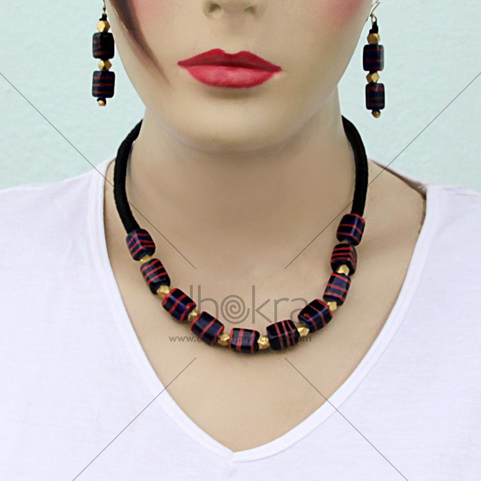 The Dhokra Harmony Avanti Set is a stunning handcrafted necklace featuring deep blue beads interspersed with delicate dhokra drops. Perfectly balancing elegance and casual charm, this versatile set is ideal for office wear, informal gatherings, or a relaxed day out with friends. A unique accessory that adds a touch of handcrafted sophistication to any outfit.