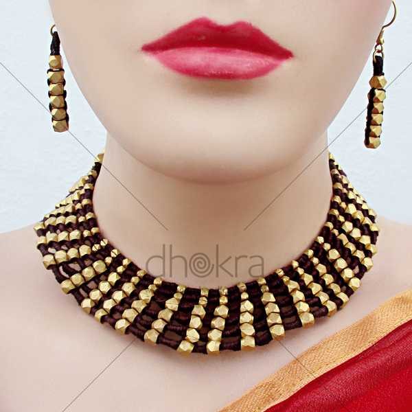 The Dhokra Hexa Avanti Set is a stunning handcrafted necklace featuring six close-knit layers of Dhokra beads intricately woven into soft brown threads. This ultra-chic design blends traditional artistry with contemporary elegance, making it perfect for the modern urban woman. Add a touch of subtle royalty and timeless tradition to your outfit with this exquisite statement piece.