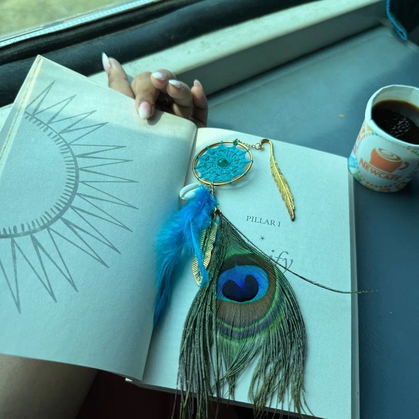 Features cut beads, charms, feathers, and kori elements attached to a metal bookmark for a stunning boho look.