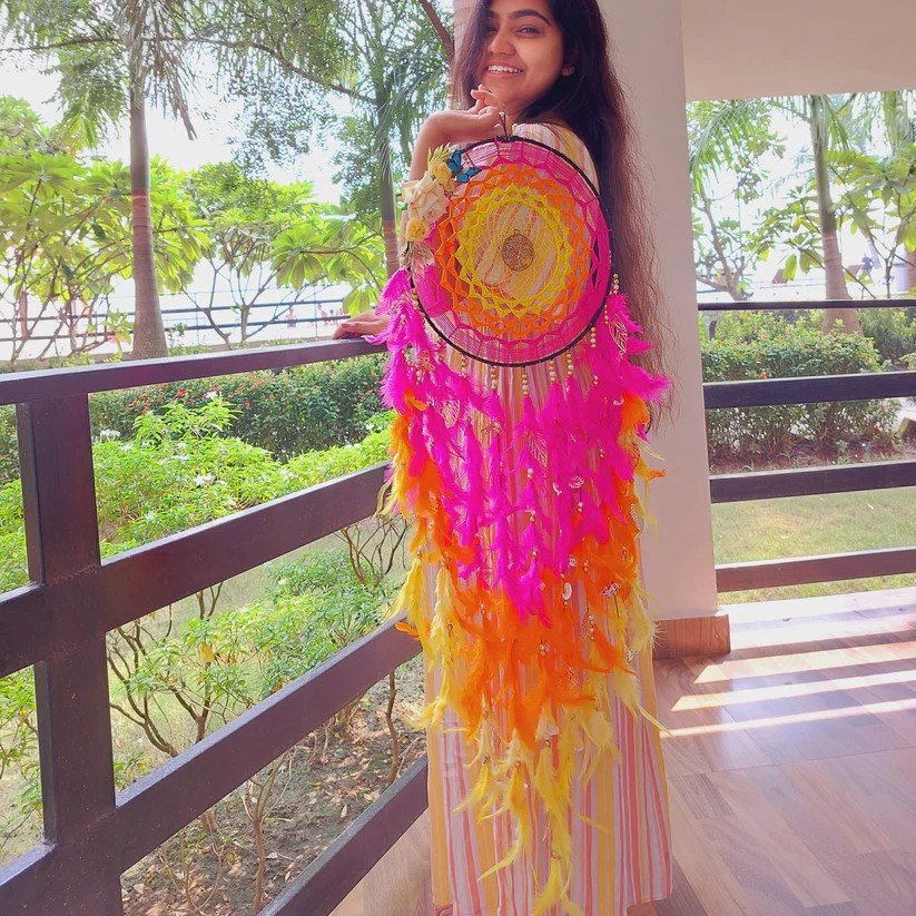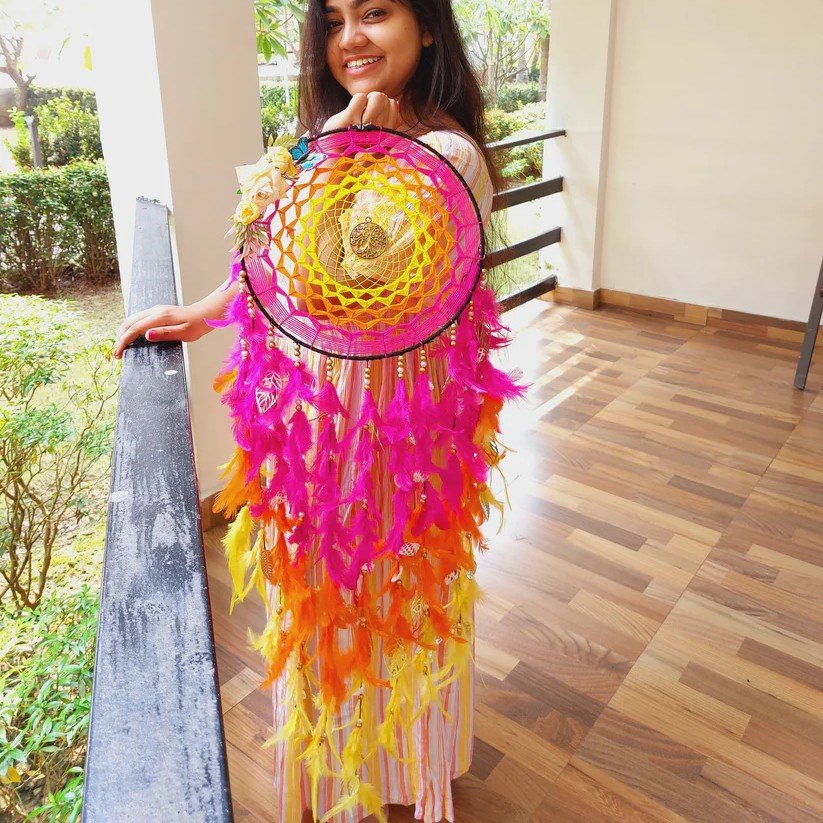 Materials Used: Wooden ring, ribbon threads, and feathers – thoughtfully crafted for a graceful, flowing design