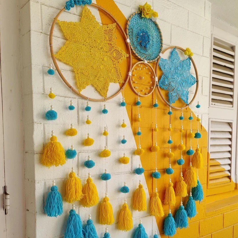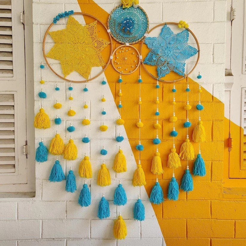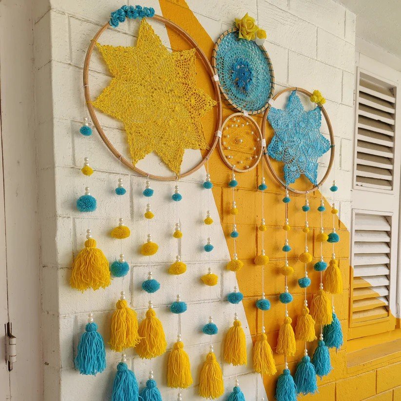 Materials Used: Wooden rings, crochet designs, threads, and artificial flowers for an elegant handcrafted appearance