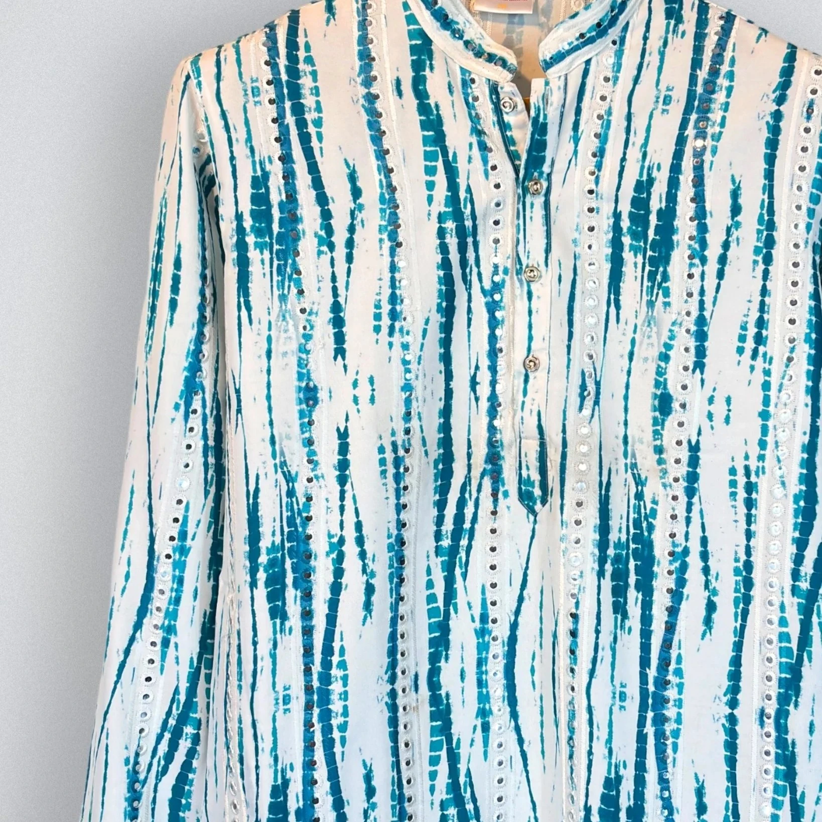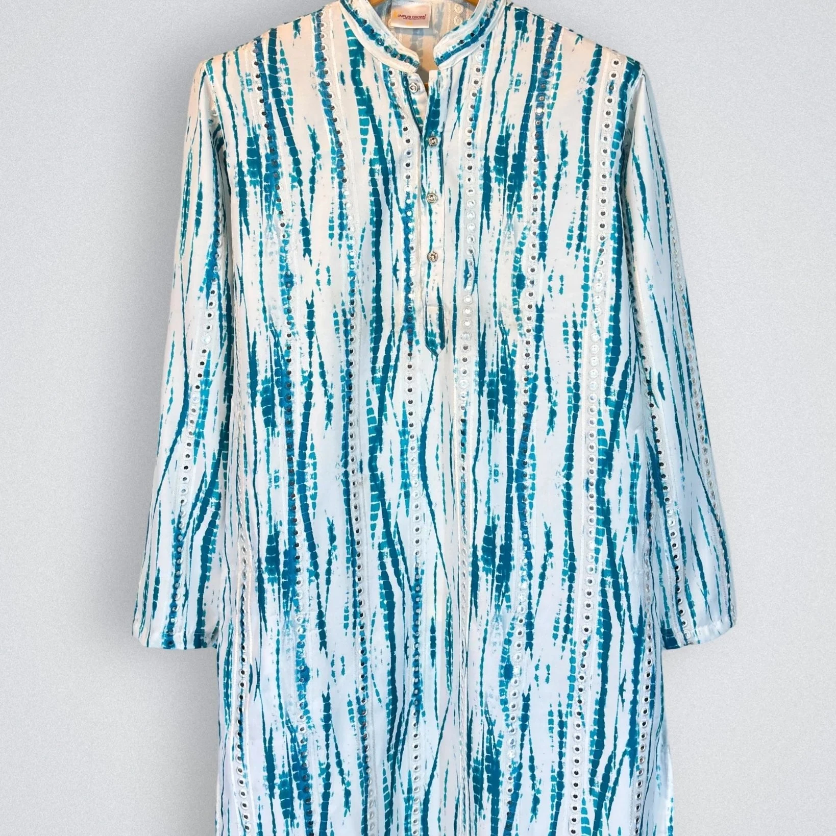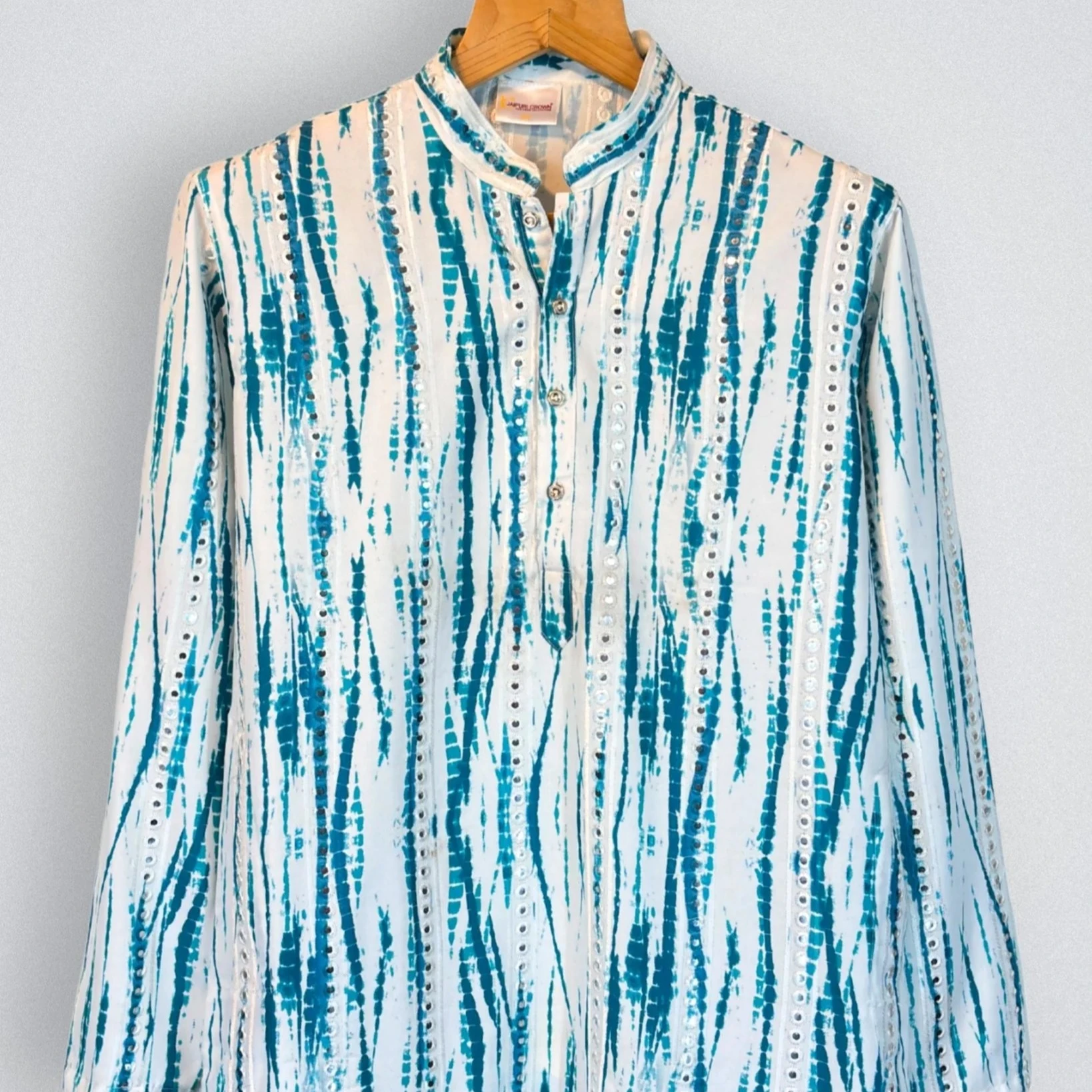 Inspired by traditional craft and updated for modern style, the Graceful Stripes Mirror Work Kurta features a crisp white base accented with soft blue vertical stripes and delicate mirror-work embroidery. Made from breathable cotton, it delivers both comfort and heritage elegance. With full sleeves, a straight-cut silhouette and band collar, this kurta is ideal for festive evenings, cultural events or refined casual ethnic wear.