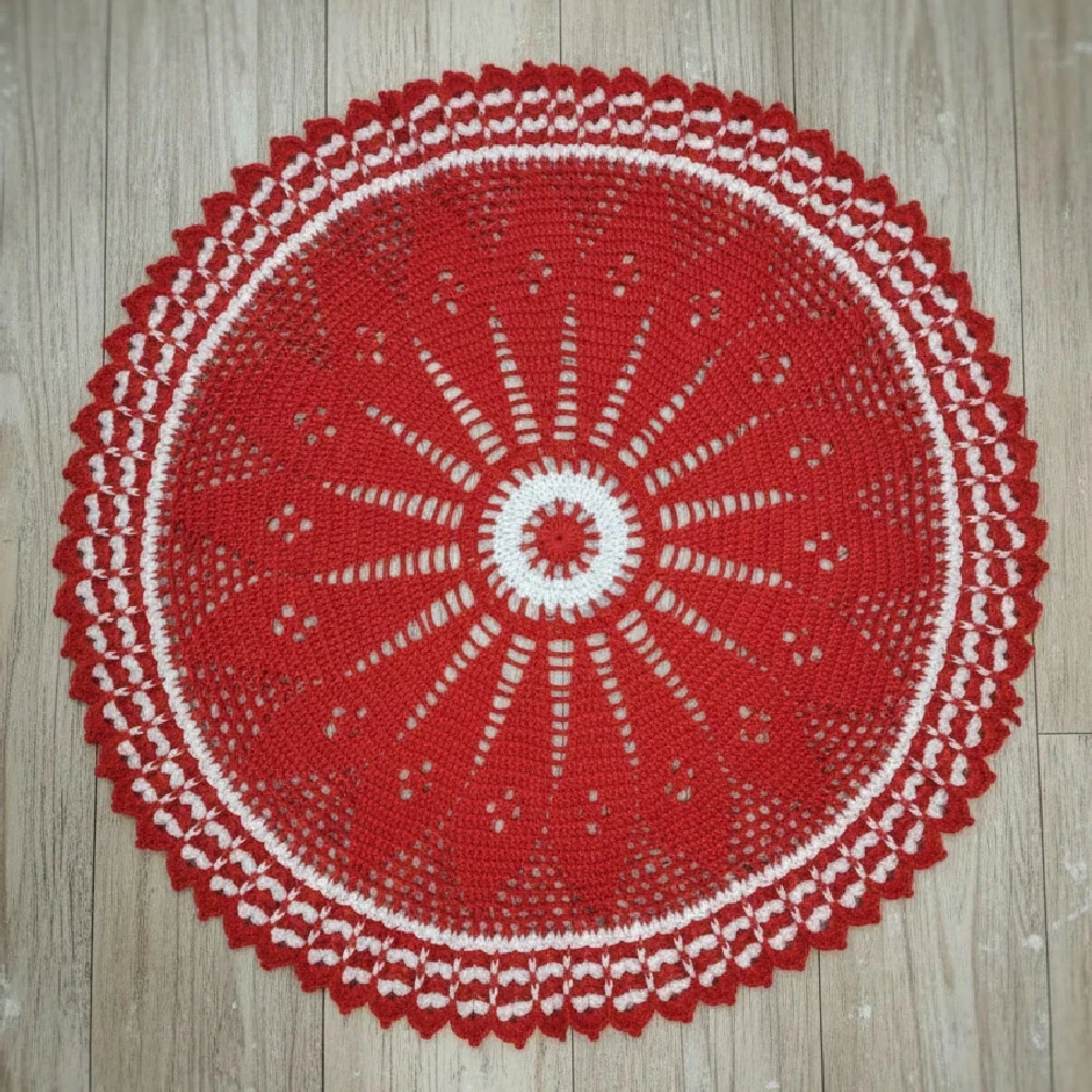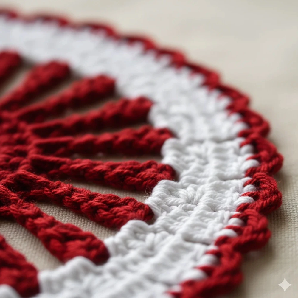 Design Aesthetics: Features a bold, highly contrasted pattern. The core is a radiant red field with radial openwork spokes, suggesting a spinning wheel or starburst. A crisp white ring frames the center, and the edge is finished with a delicate white scallop pattern.