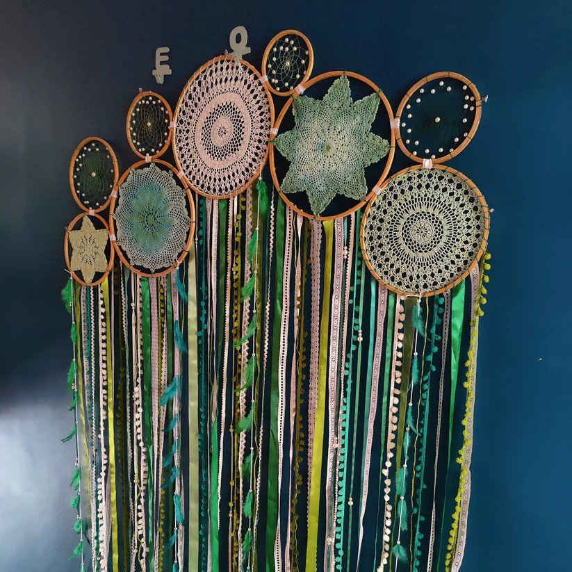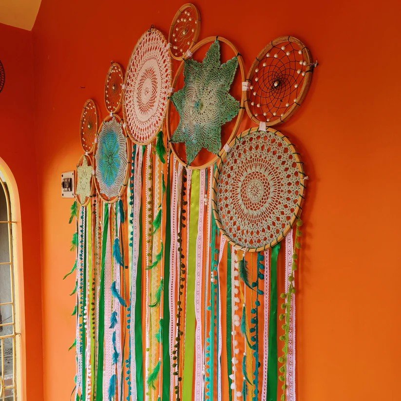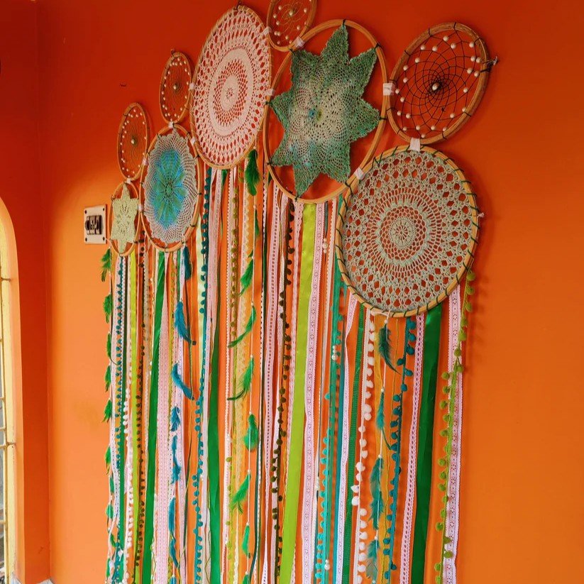 Description: Add elegance and earthy charm to your space with the Green Crochet Lace Cluster Dreamcatcher. Designed using wool, lace, wooden rings, and intricate crochet patterns, this 5x5 ft metre piece in shades of brown creates a warm and inviting ambiance. Perfect for home décor or gifting on special occasions.