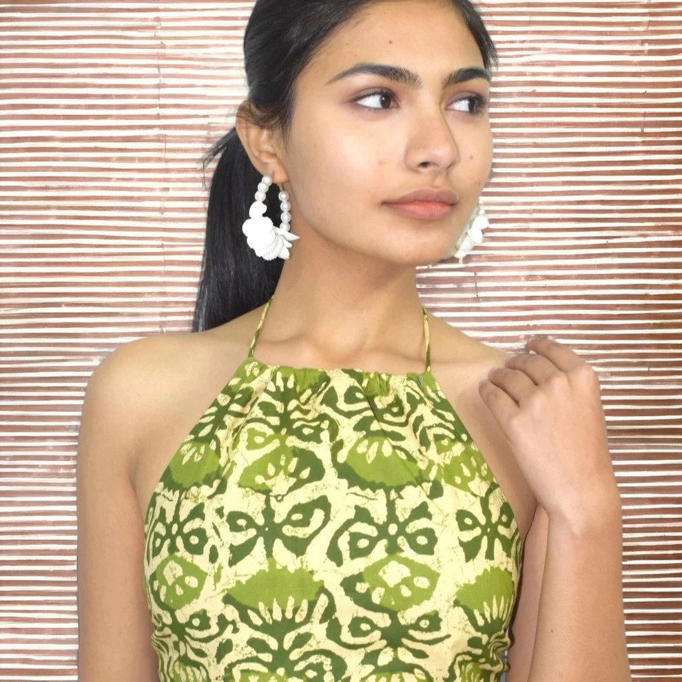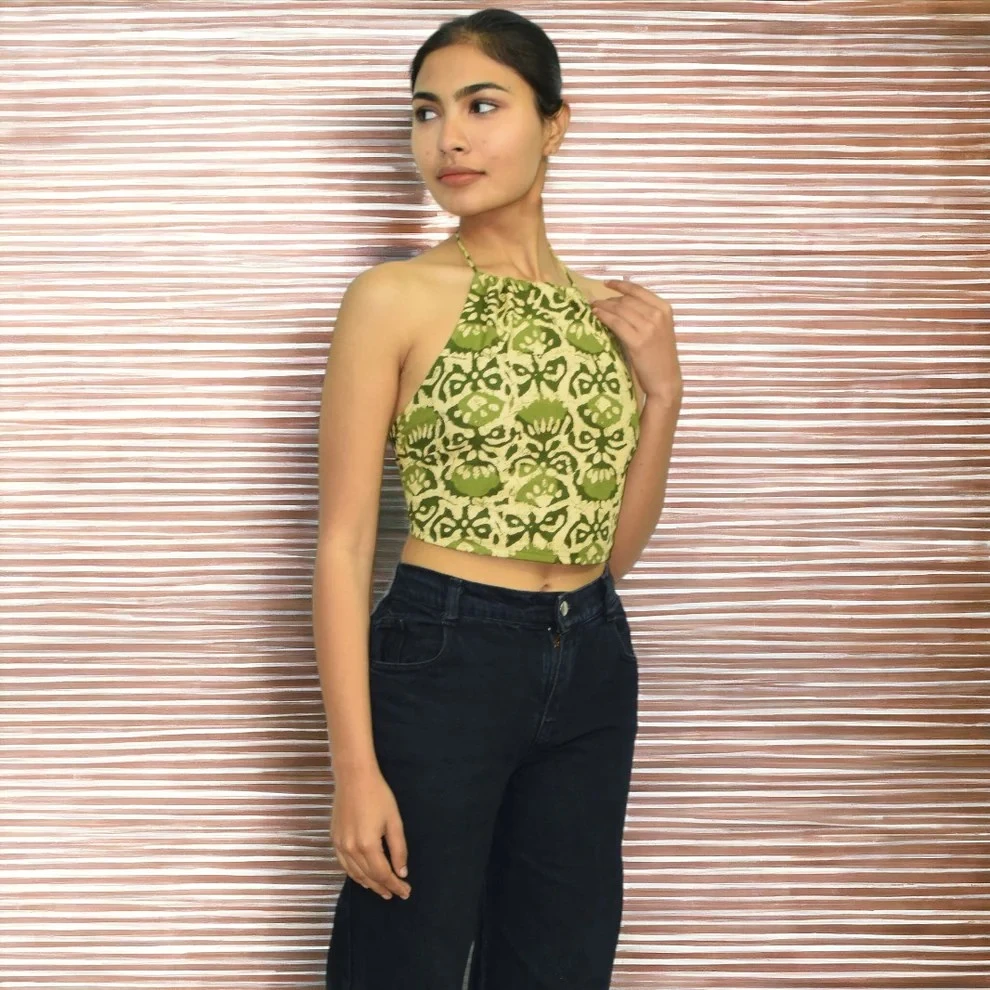 Design: Features a vibrant green base with traditional Kamal (Lotus) hand block prints.