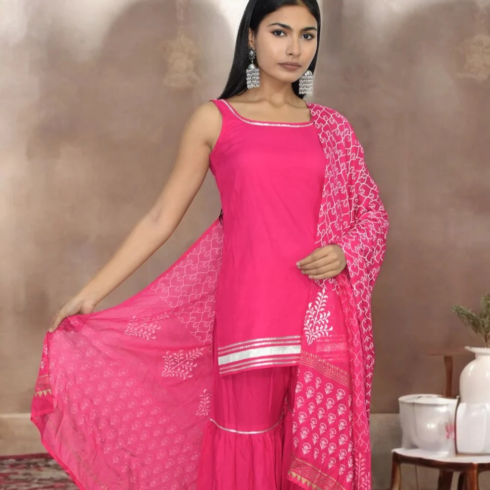 Set includes a sleeveless kurta/top, tiered sharara bottom and a matching lightweight dupatta—offering a complete, coordinated ethnic look.