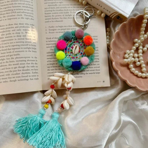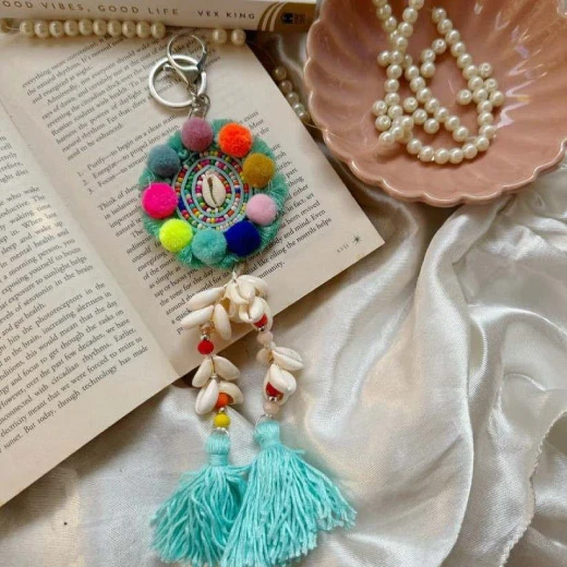 Artisanal Texture & Detail – Crafted with a sturdy brass hoop and adorned with layers of thread, charm accents, kori shells, and tassels, this keychain offers rich visual and tactile depth