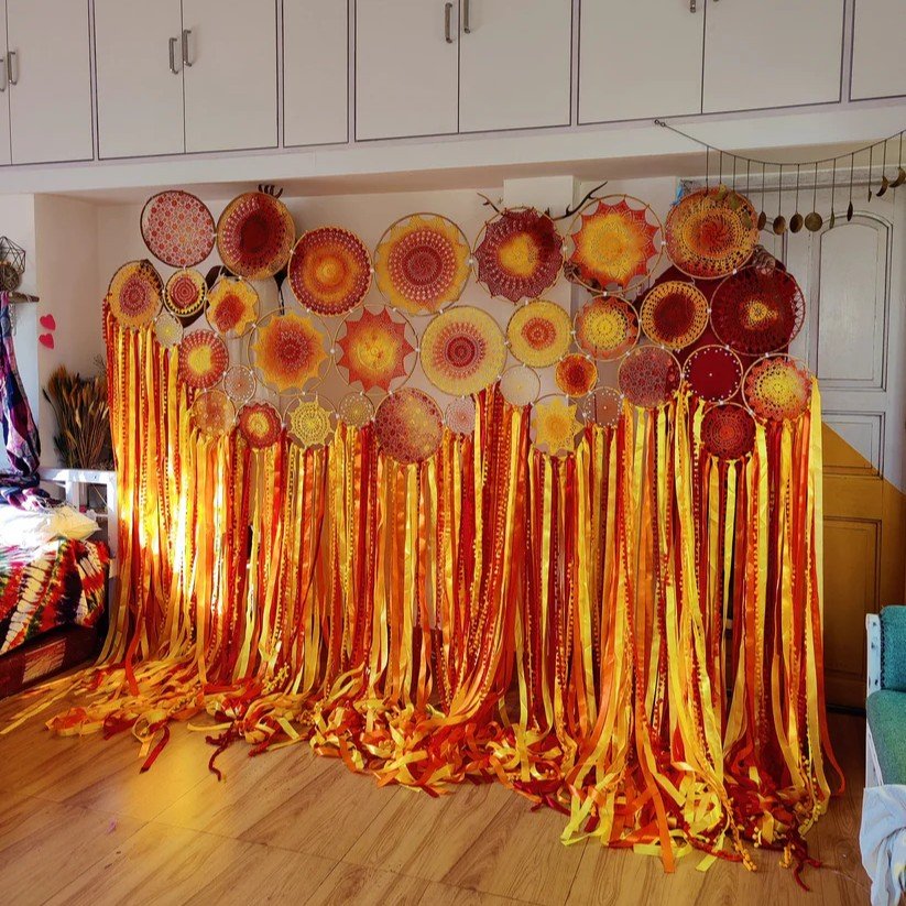 Elevate your living space with the Haldi Giant Lace Cluster Dreamcatcher, a statement boho decor piece designed to captivate and inspire. Handcrafted with delicate lace, ribbons, wooden rings, and multi-color crochets, this giant dreamcatcher creates a vibrant focal point for any room. Its warm shades of orange, yellow, red, and ochre yellow bring energy and charm, making it perfect for home decor, weddings, or special celebrations.
