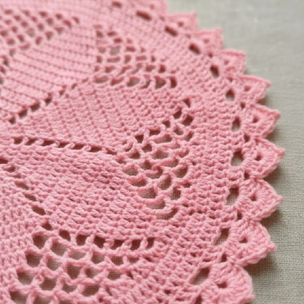 Design Aesthetics: Features a central floral mandala motif that expands into delicate openwork lacework. The perimeter is finished with a detailed scalloped (picot) edging, providing a polished and elegant silhouette.
