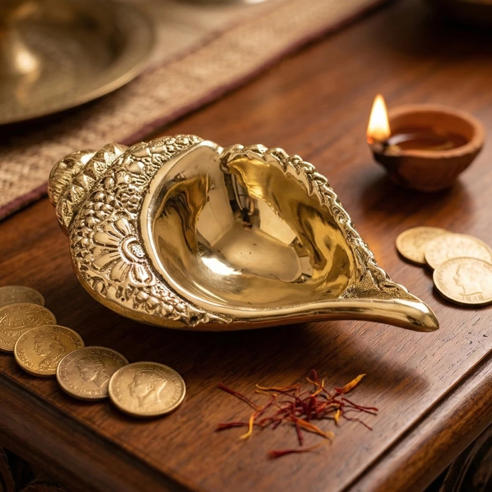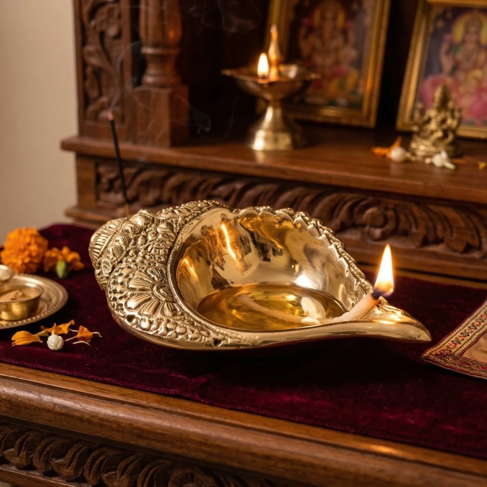Illuminate your spiritual space with this Handcrafted Brass Shankh Diya, beautifully crafted using traditional Moradabad metal art techniques. The diya is designed in the shape of a Shankh (conch shell), which holds deep spiritual significance in Hindu traditions and symbolizes purity, prosperity, and positive energy.
