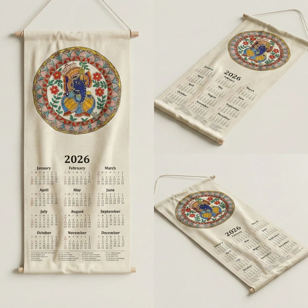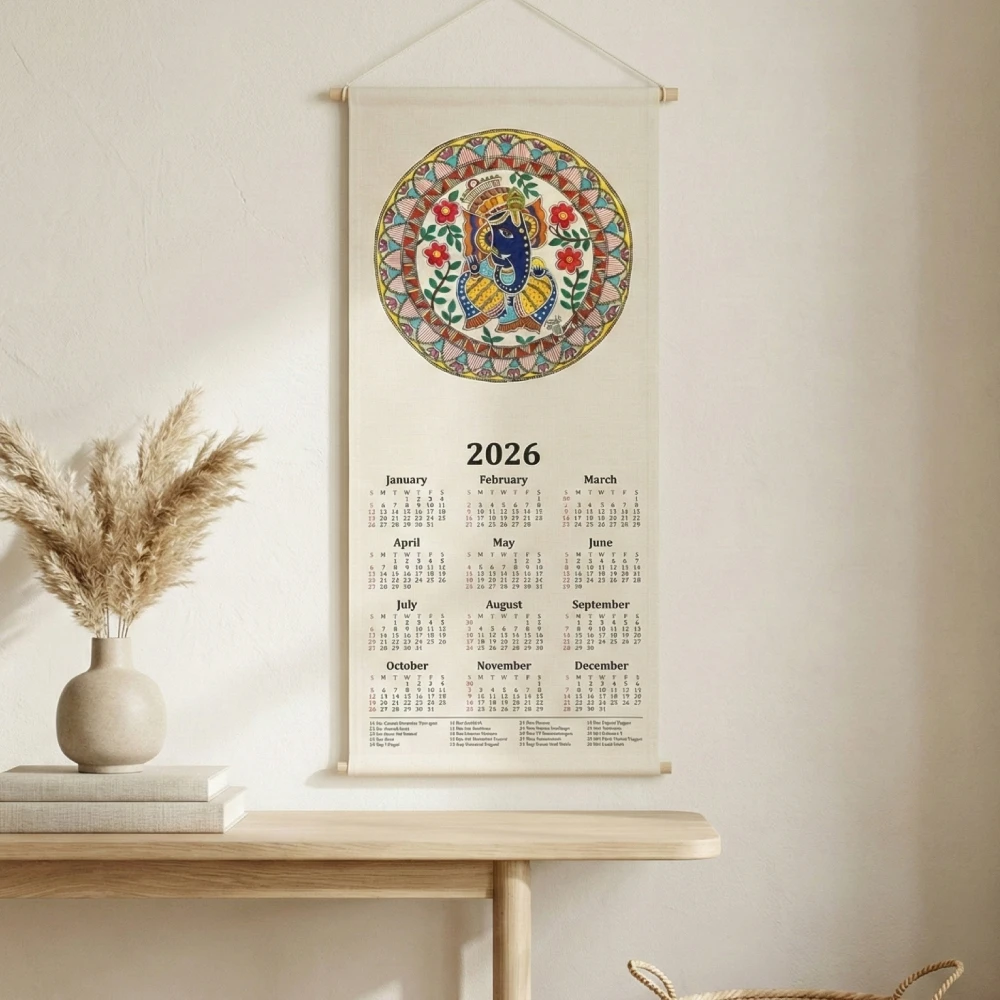 Welcome positivity and auspicious beginnings with this Handcrafted Fabric Wall Calendar 2026 – Circular Ganesh Folk Art Design.