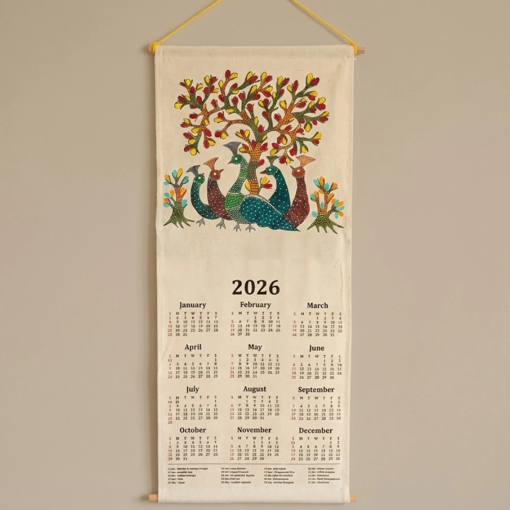 Designed by skilled artisans, this wall calendar showcases vibrant folk art motifs inspired by Indian heritage, printed on high-quality fabric.