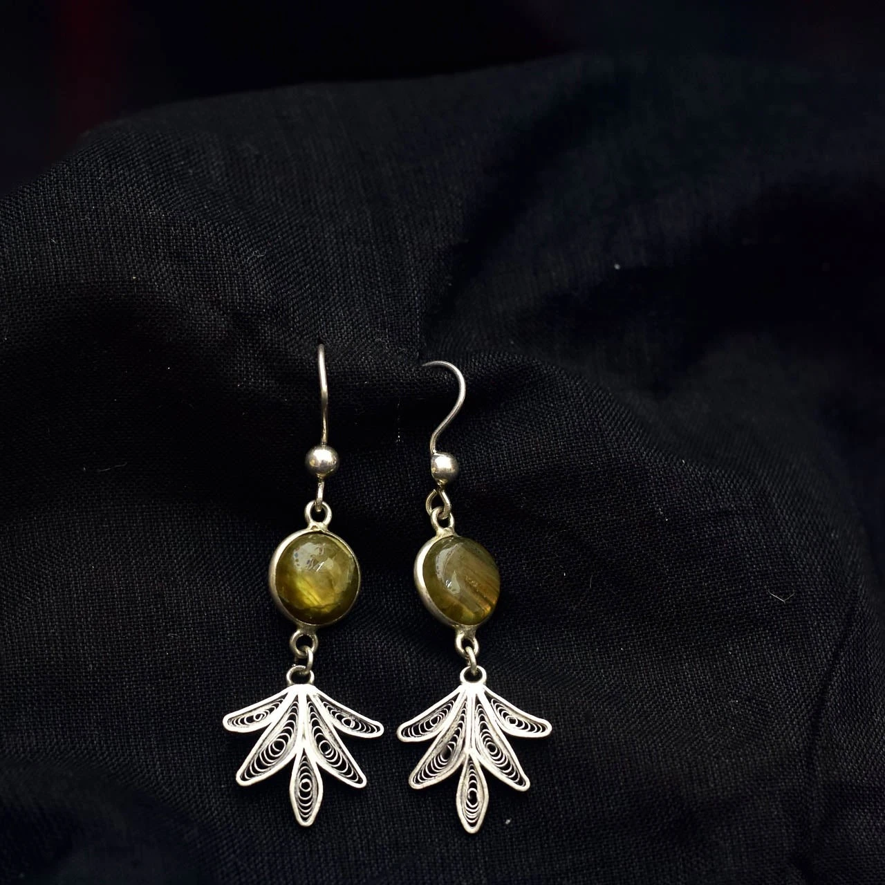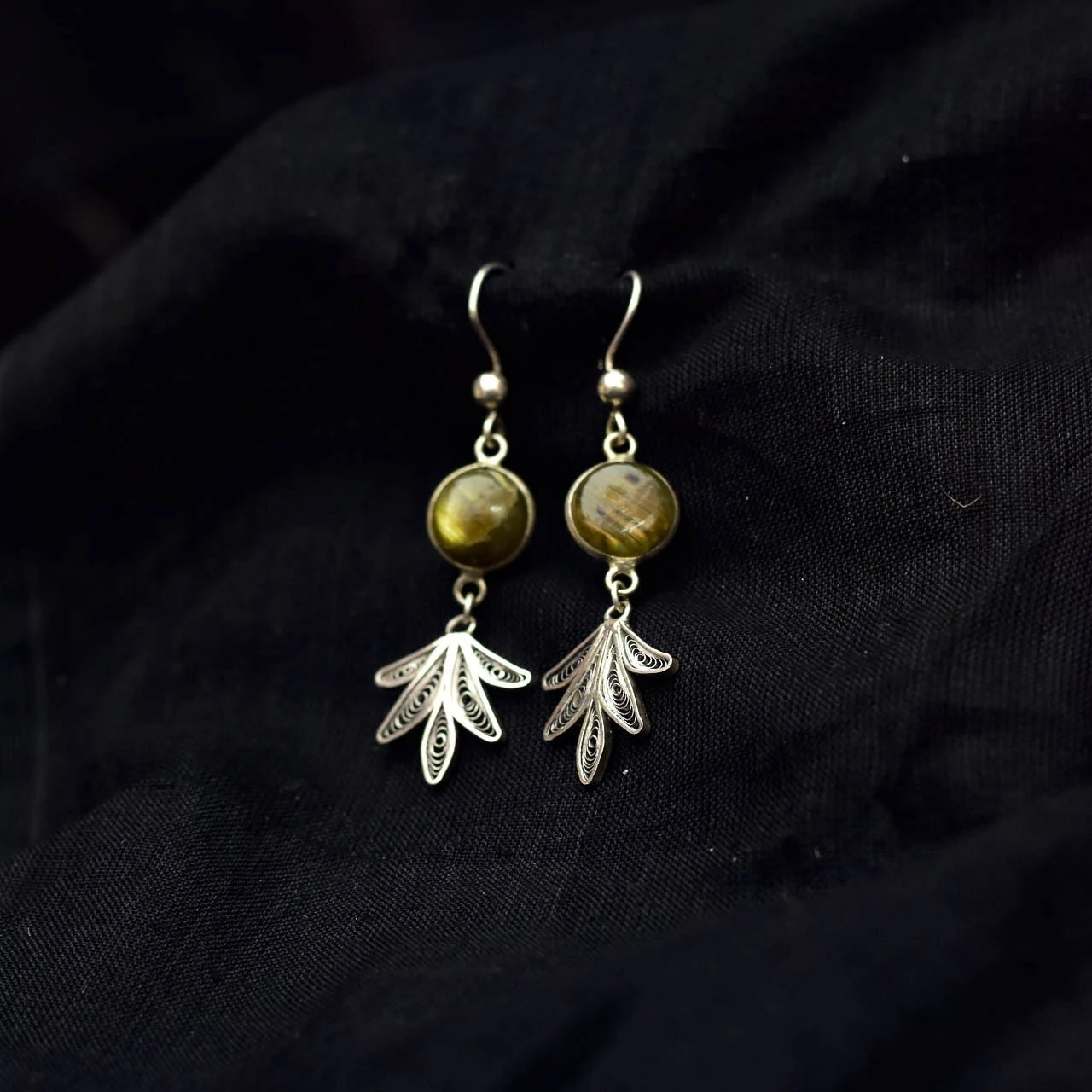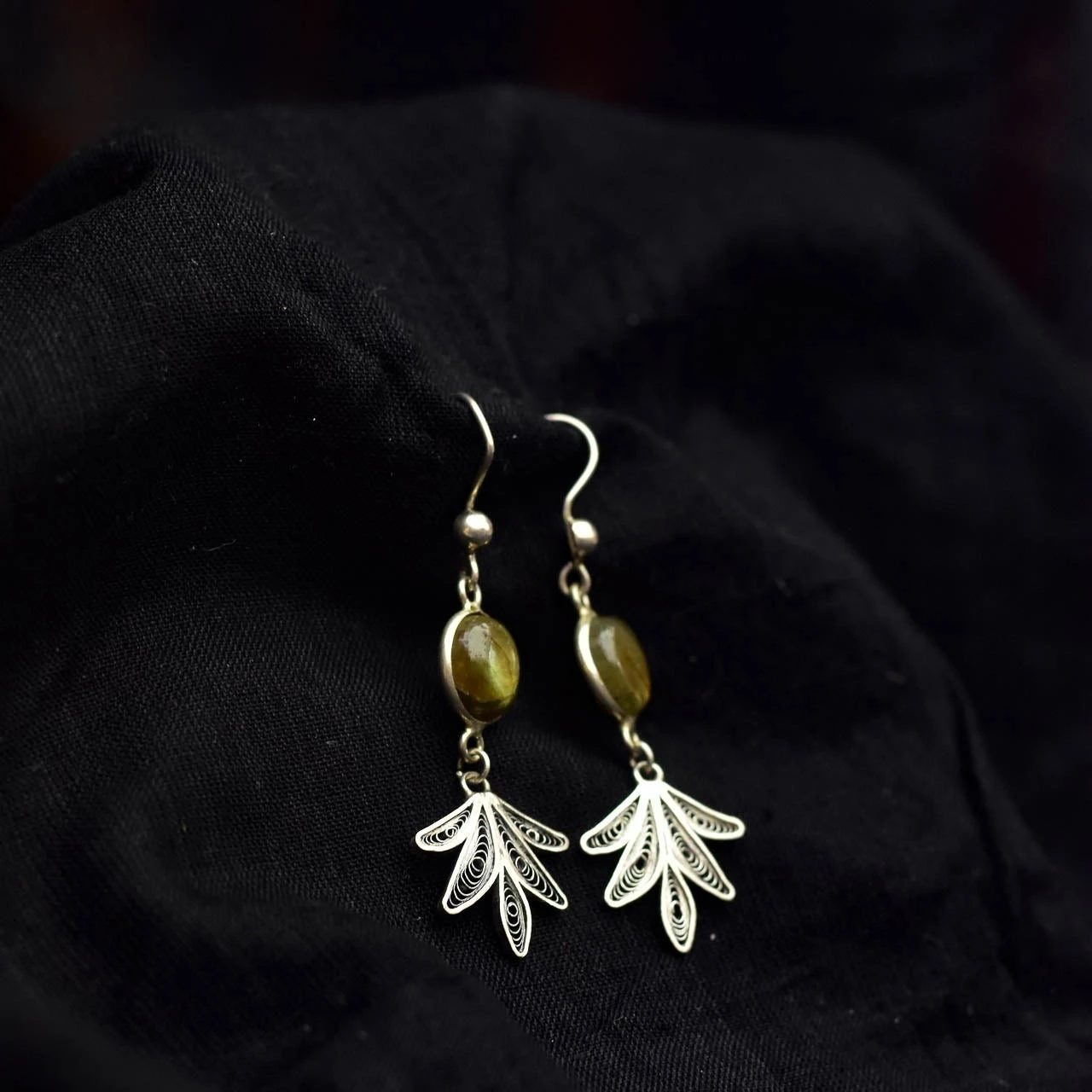 Elevate your everyday and festive looks with these elegant handcrafted drop earrings from Uthalamrita. Featuring a natural green gemstone set in a minimal silver bezel, the design is beautifully complemented by delicate filigree leaf charms that add graceful movement and artisanal charm.