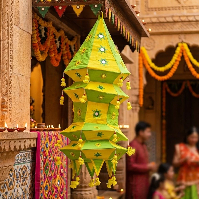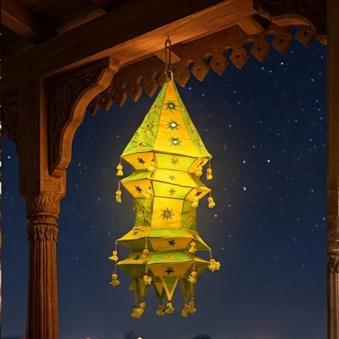 This handcrafted green and yellow fabric hanging lantern is a beautiful example of traditional Indian decorative art. Made using premium fabric panels with intricate embroidery and mirror-style accents, it features a vibrant color combination that instantly brightens any space. The layered structure and fine detailing reflect skilled craftsmanship and cultural elegance.