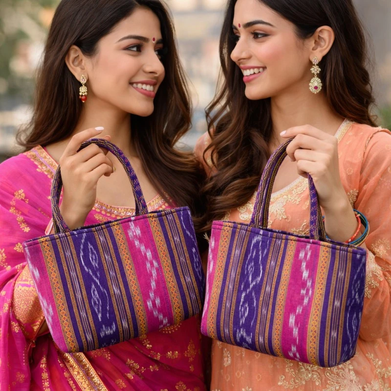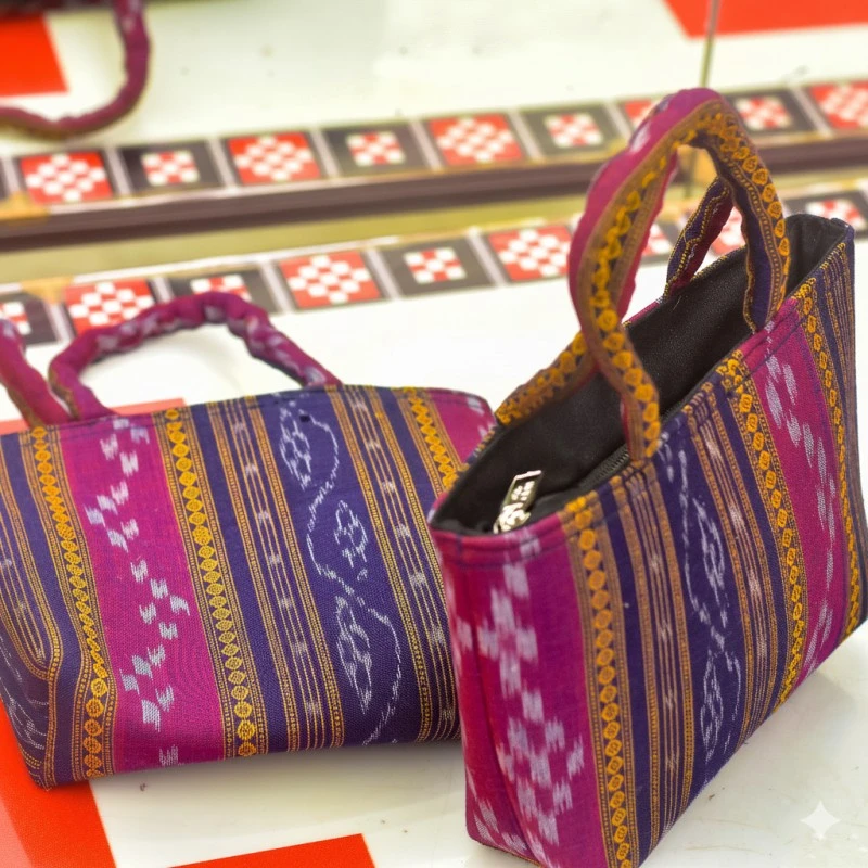 Sambalpuri bags are handcrafted tote bags, handbags, and sling bags from Odisha, India, known for their virant colors, unique designs and the traditional Ikat technique. These bags are made using natural fibers and emphasize sustainability and eco-consciousness. They are more than just accessories; they are a statement of tradition, craftsmanship, and style.