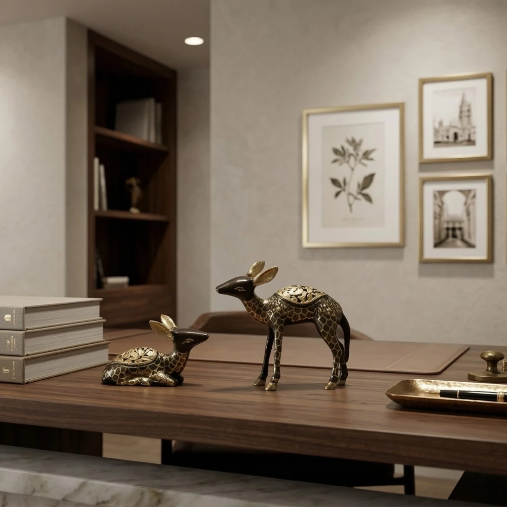 Add a touch of elegance and traditional craftsmanship to your décor with this Handcrafted Metal Deer Pair Showpiece (5 Inch & 4 Inch) made using traditional Moradabad metal art techniques. The deer symbolizes grace, peace, prosperity, and gentle beauty, making it a meaningful decorative piece for homes and offices.