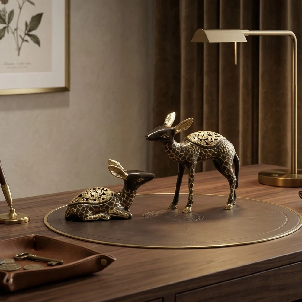 This decorative pair features intricate handcrafted patterns with a beautiful antique metal finish. The combination of a standing and sitting deer creates a balanced and visually appealing display, perfect for tables, shelves, office desks, or display cabinets.