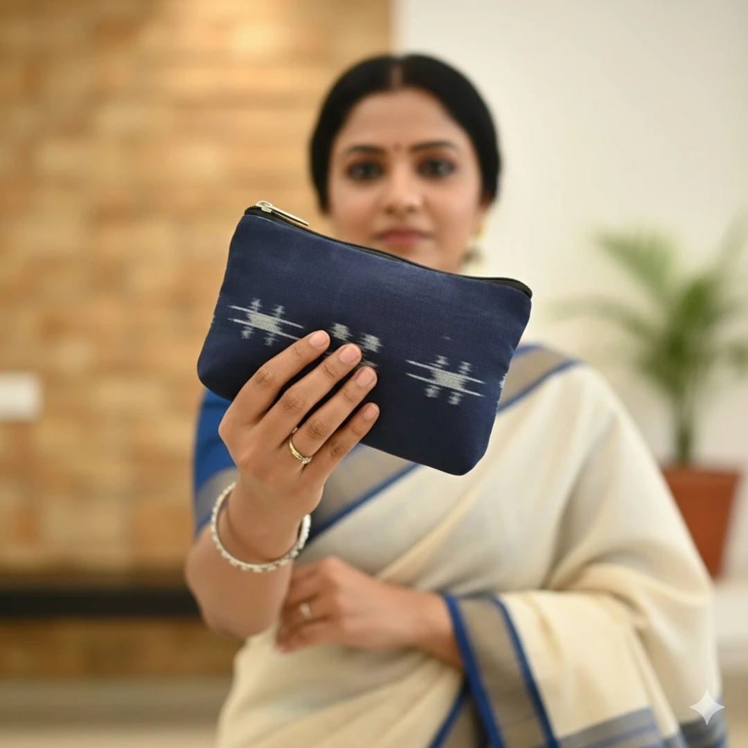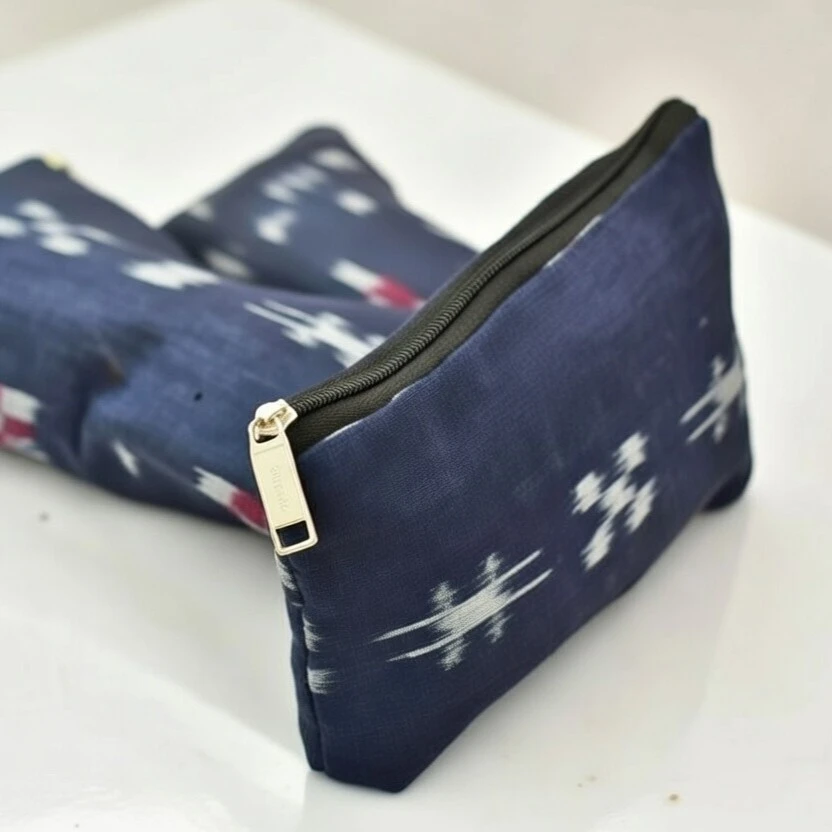 This handcrafted navy blue ikat fabric zipper pouch reflects the timeless elegance of traditional Indian weaving. Made from premium handwoven ikat fabric, the deep navy blue base with subtle white motifs gives it a sophisticated ethnic look. Neat stitching and a smooth zipper closure ensure durability and secure storage for your essentials.