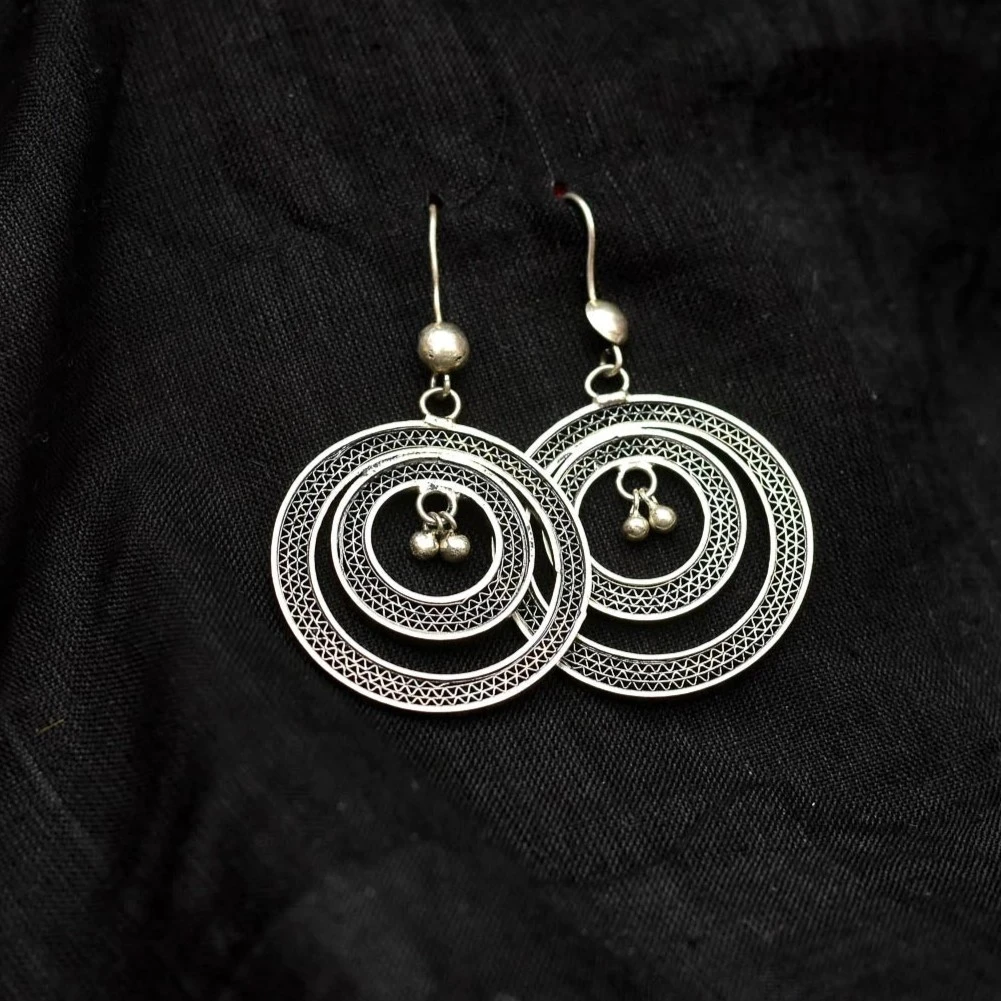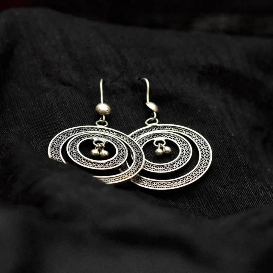 Make a subtle yet striking style statement with these handcrafted concentric circle drop earrings from Uthalamrita. Designed with multiple delicately textured silver rings and a softly dangling bead detail at the center, these earrings celebrate balance, movement, and fine craftsmanship.