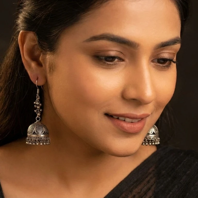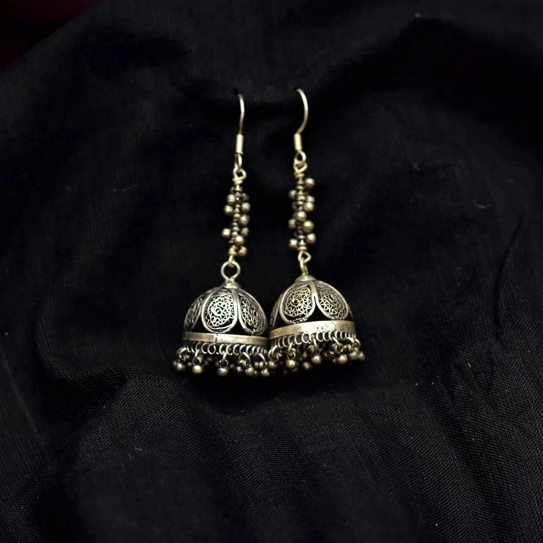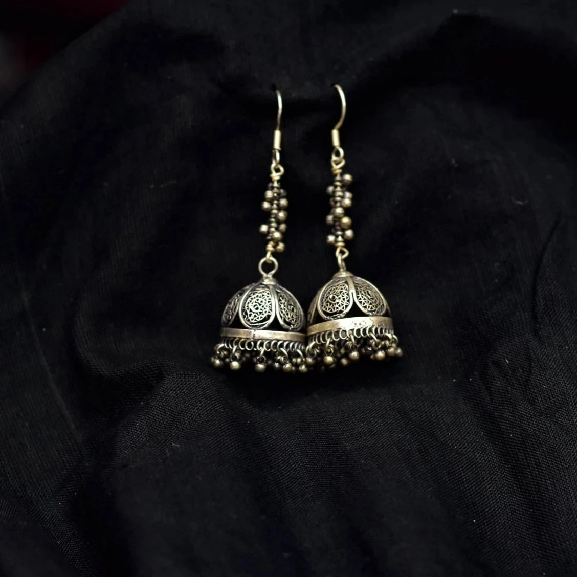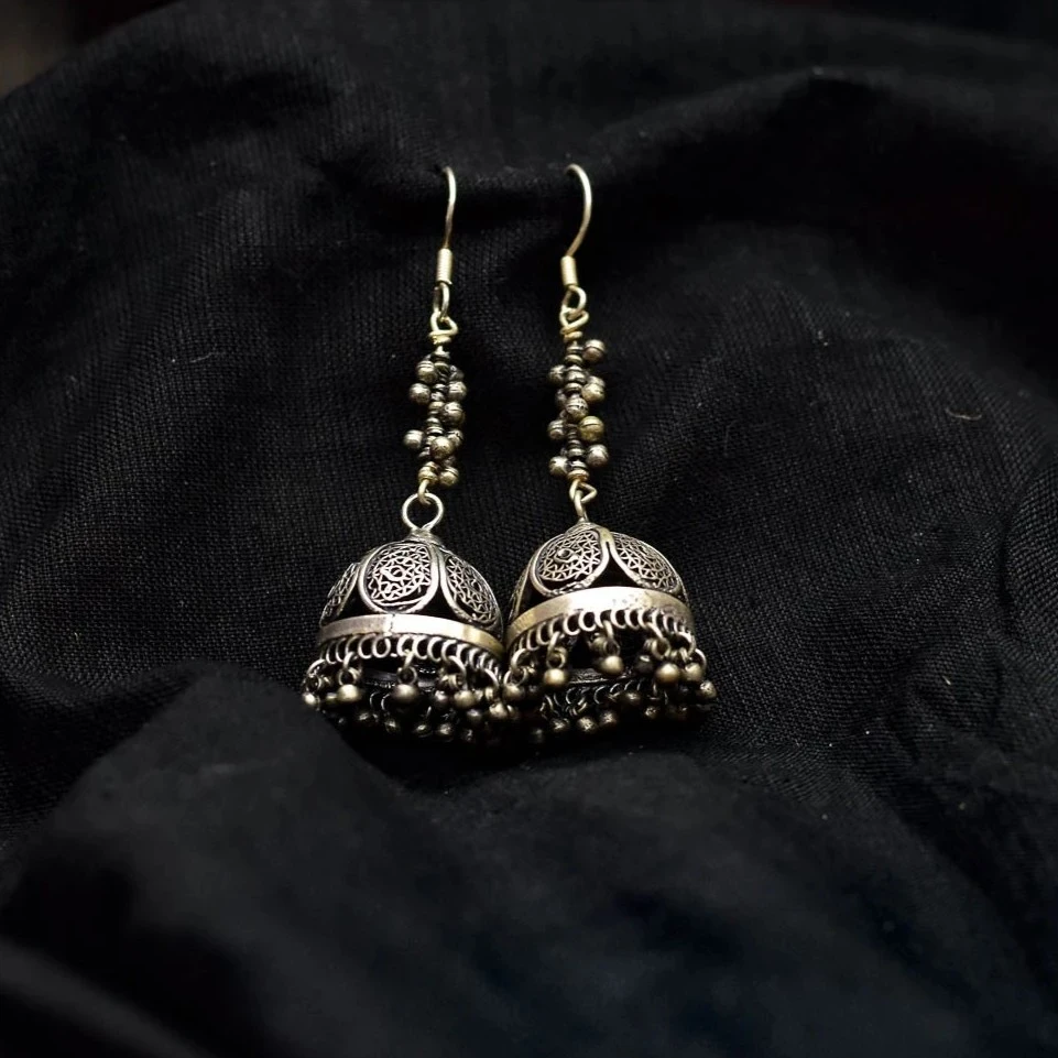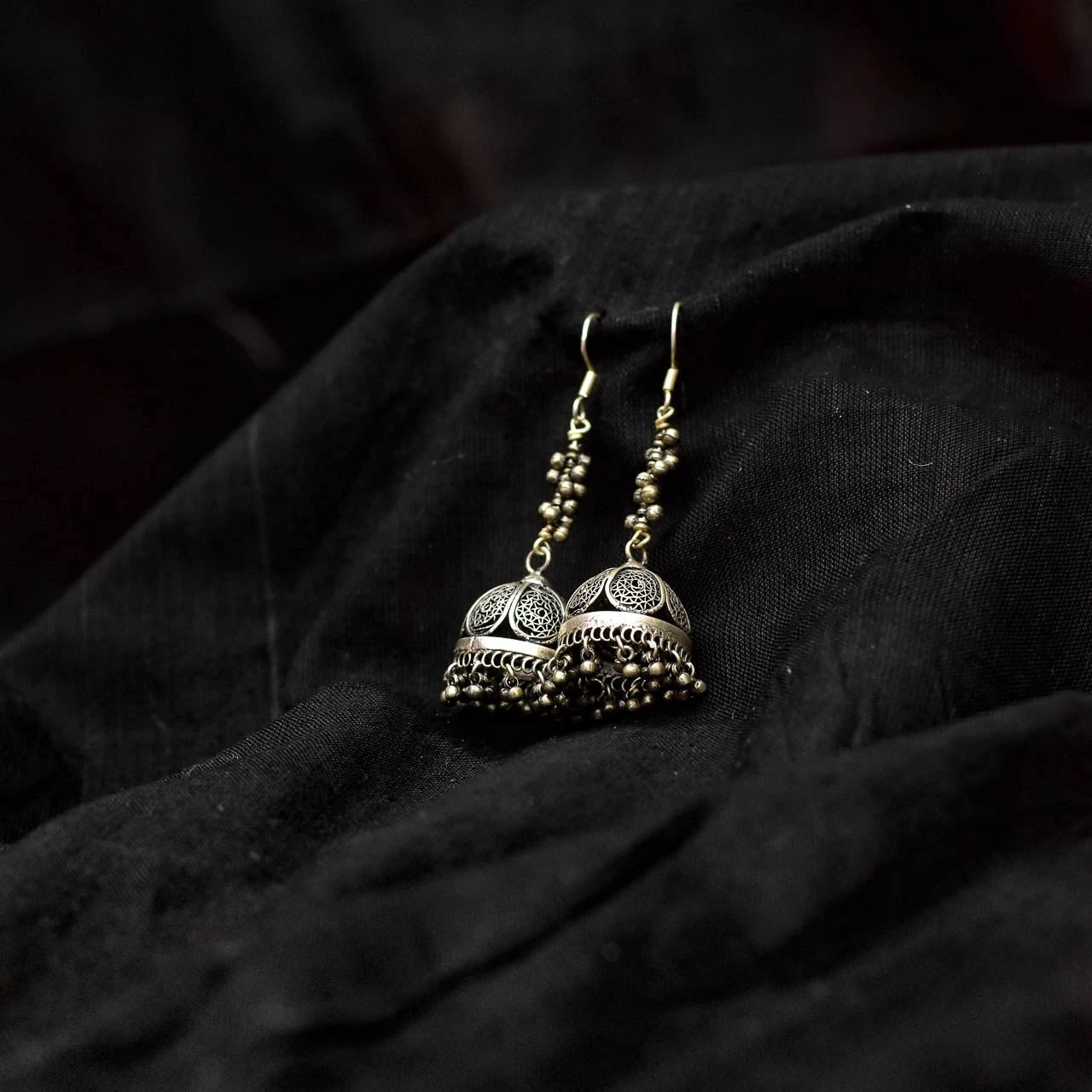 Celebrate timeless Indian craftsmanship with these handcrafted silver jhumka drop earrings from Uthalamrita. Designed with an intricately detailed dome-shaped jhumka and finished with delicate dangling silver beads, this pair reflects classic elegance with a refined artisanal touch.