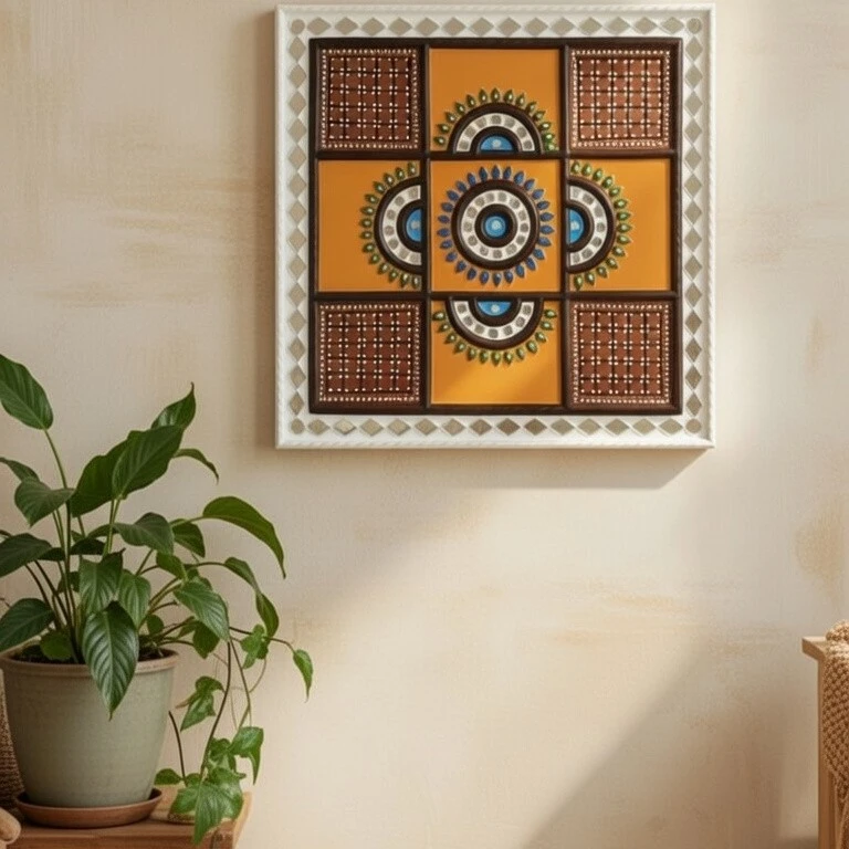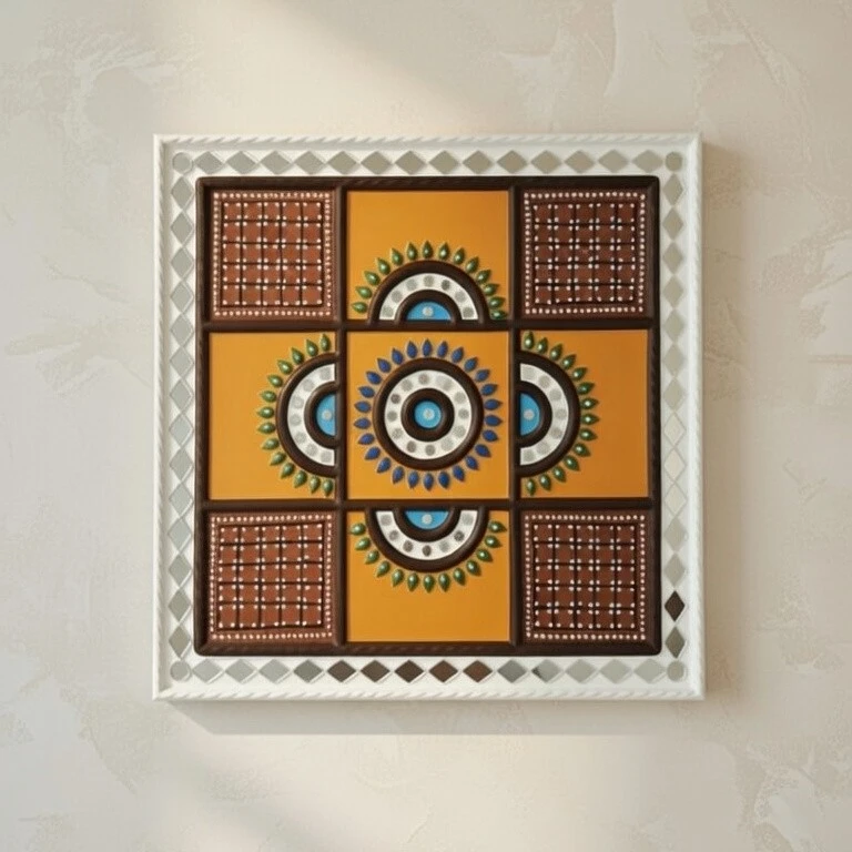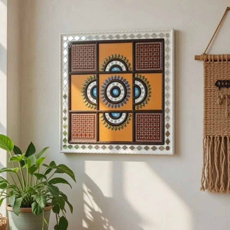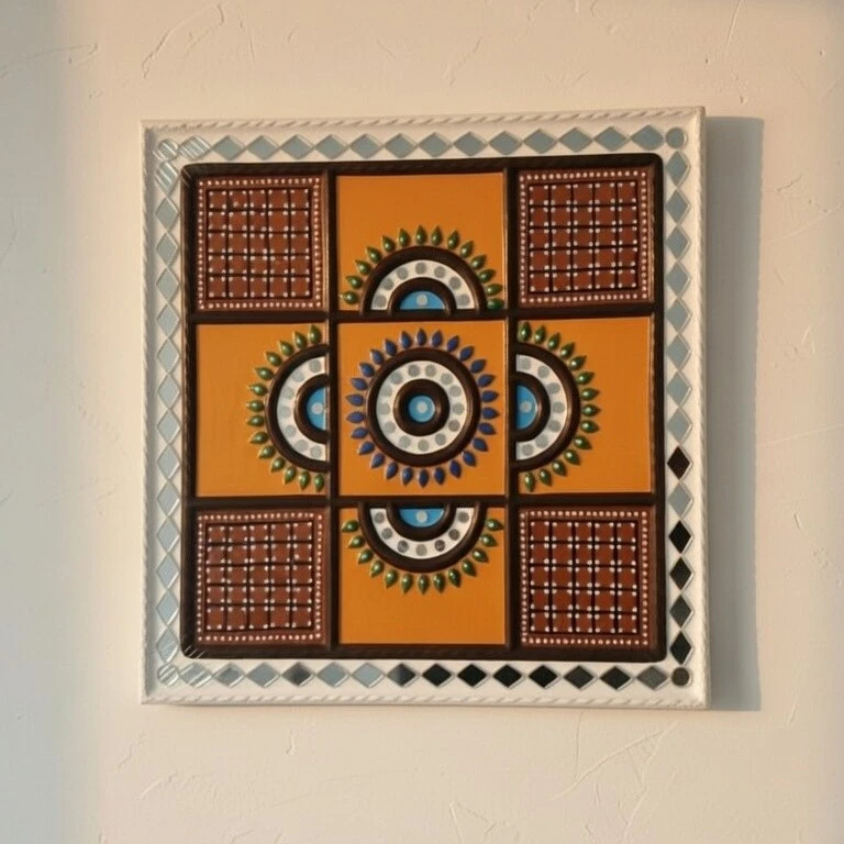 This beautifully handcrafted Lippan Art wall décor is inspired by the traditional mud and mirror art of Gujarat, India. Designed in a balanced geometric and mandala pattern, this 12 × 12 inch artwork adds an elegant ethnic charm to any interior space.