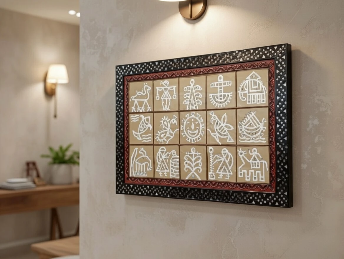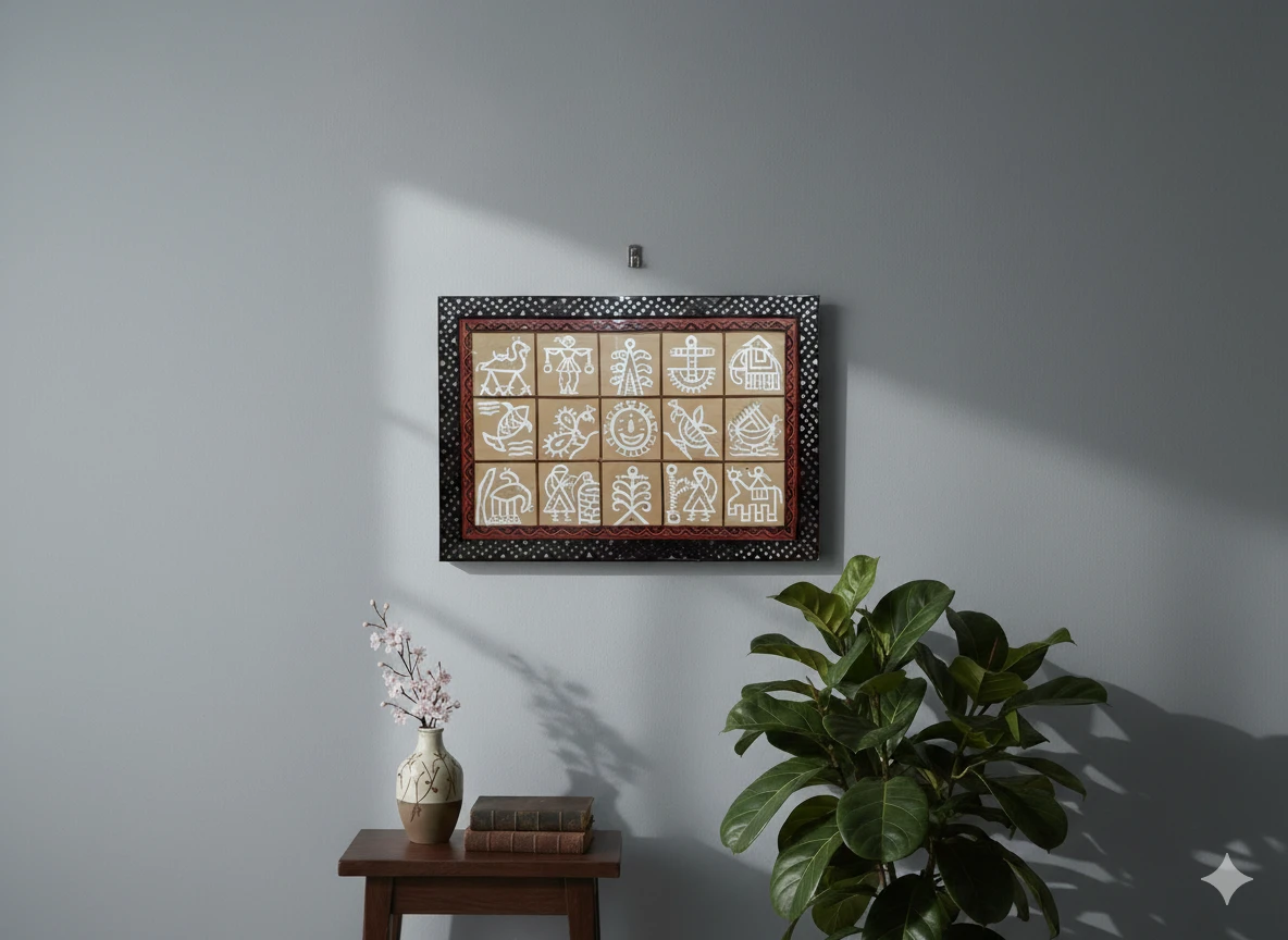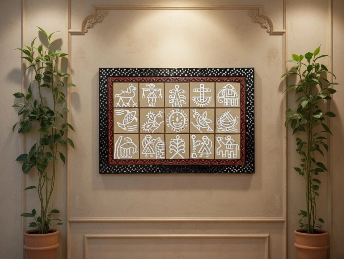The earthy base tones paired with crisp white relief work and a bold decorative border give this piece a striking visual presence. Measuring 24 × 36 inches, this large-format panel serves as a powerful statement décor element for living rooms, hallways, offices, boutique hotels, cultural spaces, and art galleries. Each panel is handcrafted by skilled artisans, making every piece unique.