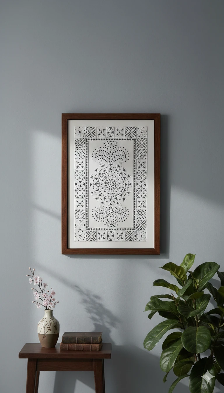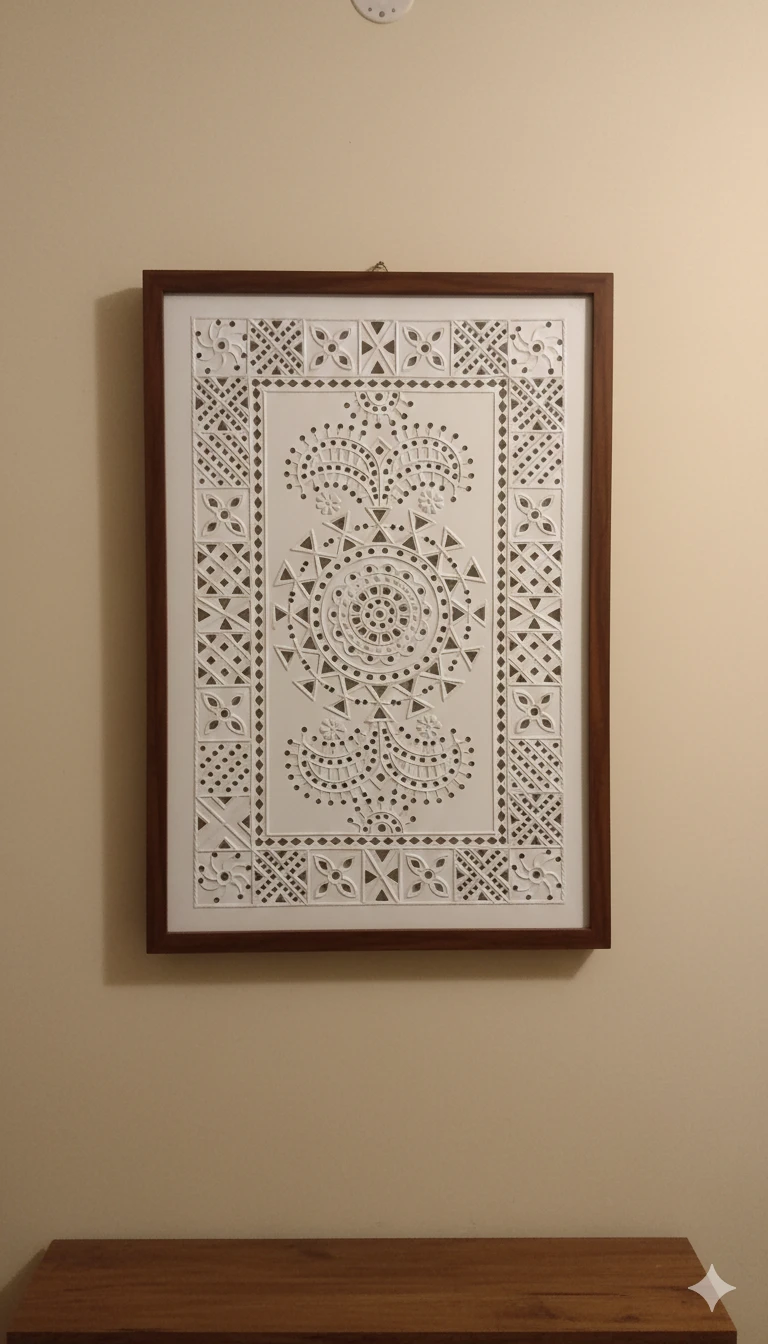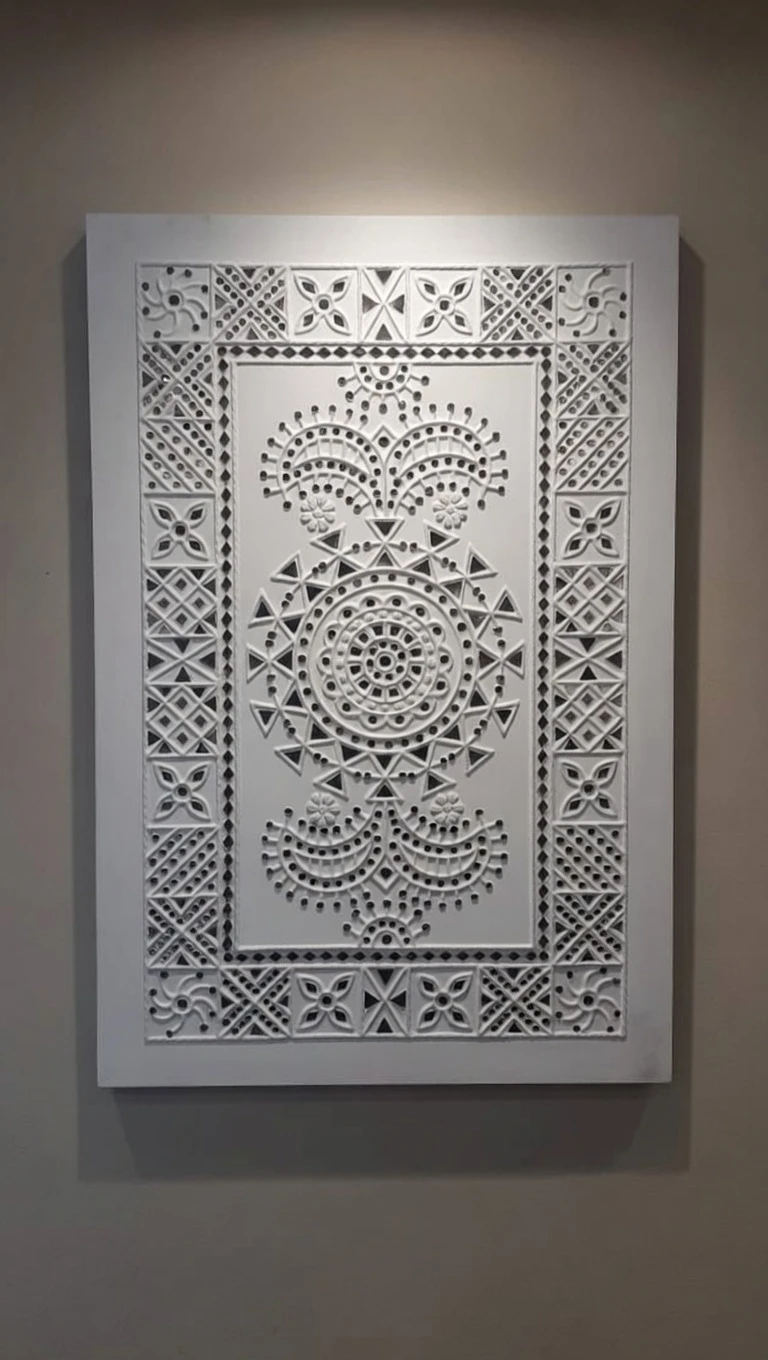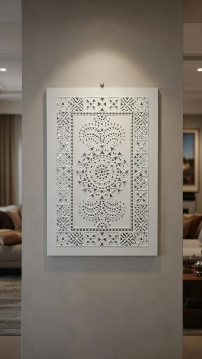 This elegant handcrafted Lippan Art wall panel blends traditional Indian craftsmanship with a modern, minimalist aesthetic. Finished in a refined white tone, the artwork features intricate geometric and mandala-inspired patterns created using natural mud relief and delicate mirror detailing.