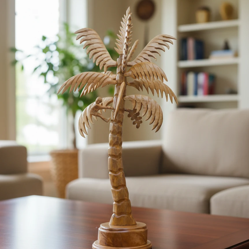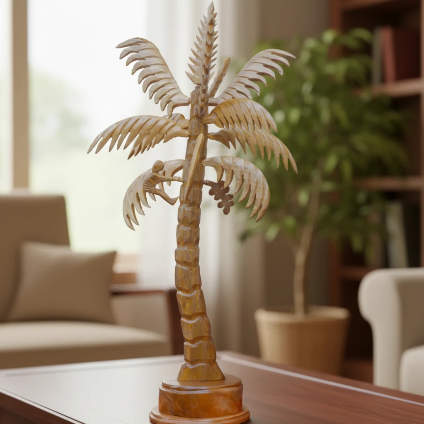 Enhance your living space with the natural charm of this Handcrafted Wooden Coconut Tree Showpiece. Expertly carved by skilled artisans, this elegant décor piece reflects fine craftsmanship through its detailed trunk, layered palm leaves, and sturdy base.