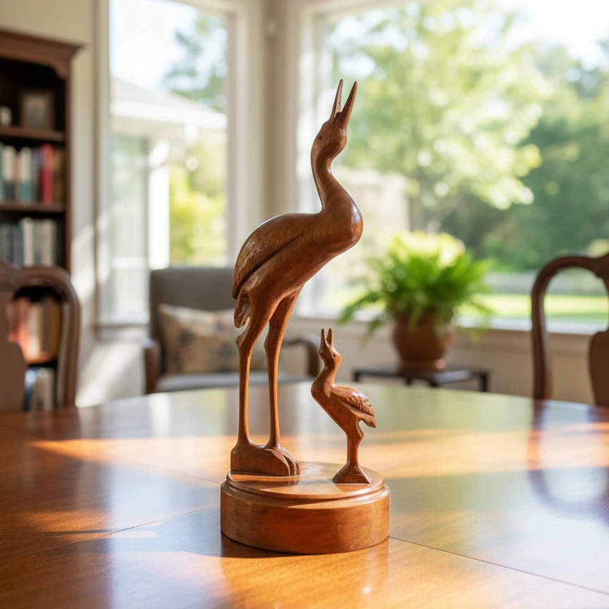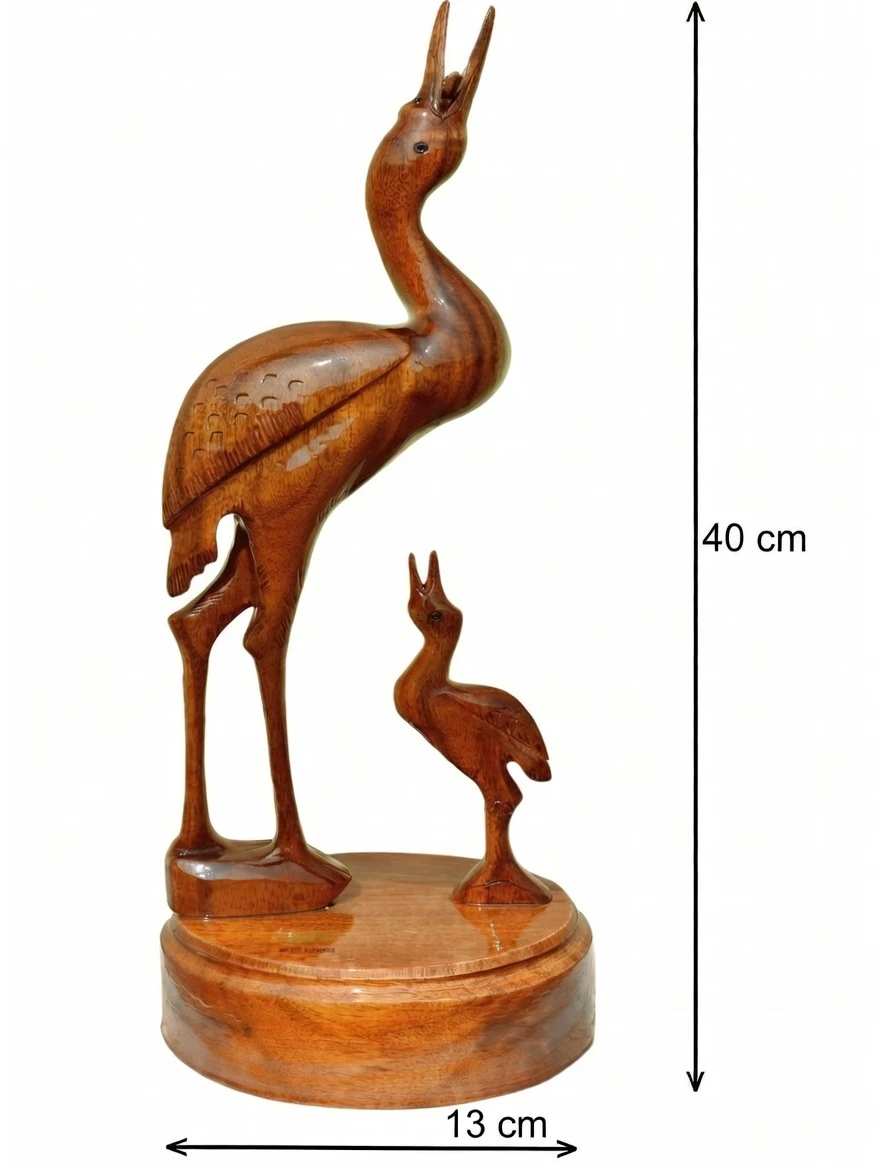 Bring a touch of nature and elegance to your space with this Handcrafted Wooden Heron Showpiece, beautifully carved by skilled artisans. Featuring an upward-raised head posture and a charming mother–baby heron composition, this décor piece symbolizes care, grace, and harmony. Finished in a rich natural brown polish, it highlights the wood grain and adds warmth to any table, shelf, or rack décor setting.