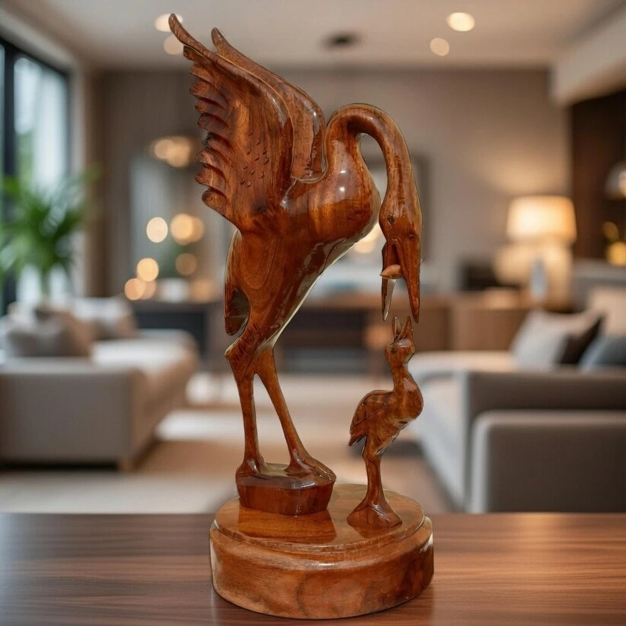 Add a graceful artistic accent to your interiors with this Handcrafted Wooden Heron Showpiece, designed in a striking raised-wings posture. Skillfully carved by traditional artisans, this sculpture showcases fine detailing, smooth curves, and a rich natural brown polish that highlights the beauty of real wood. The elegant mother-and-chick composition symbolizes protection, care, and harmony, making it a meaningful décor piece for homes and offices alike.
