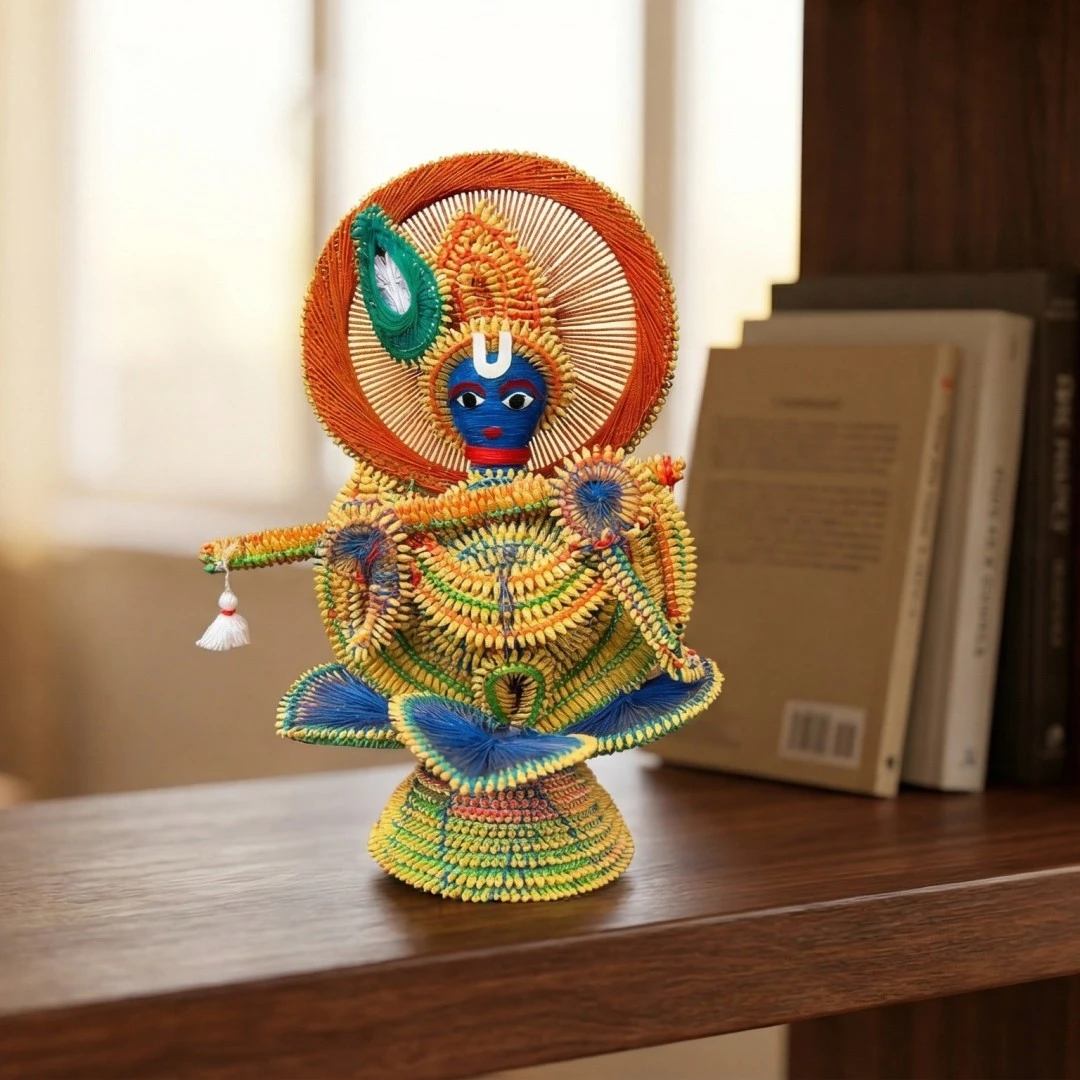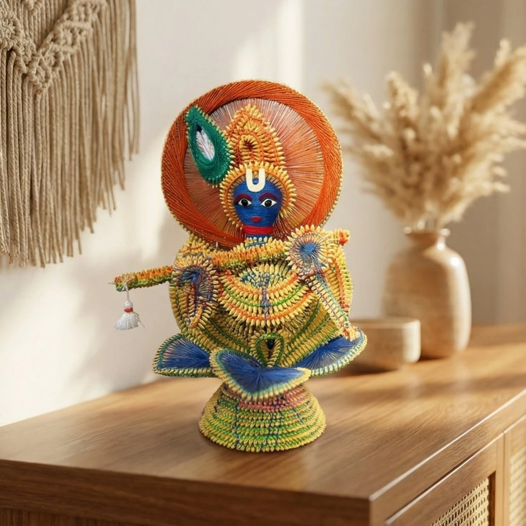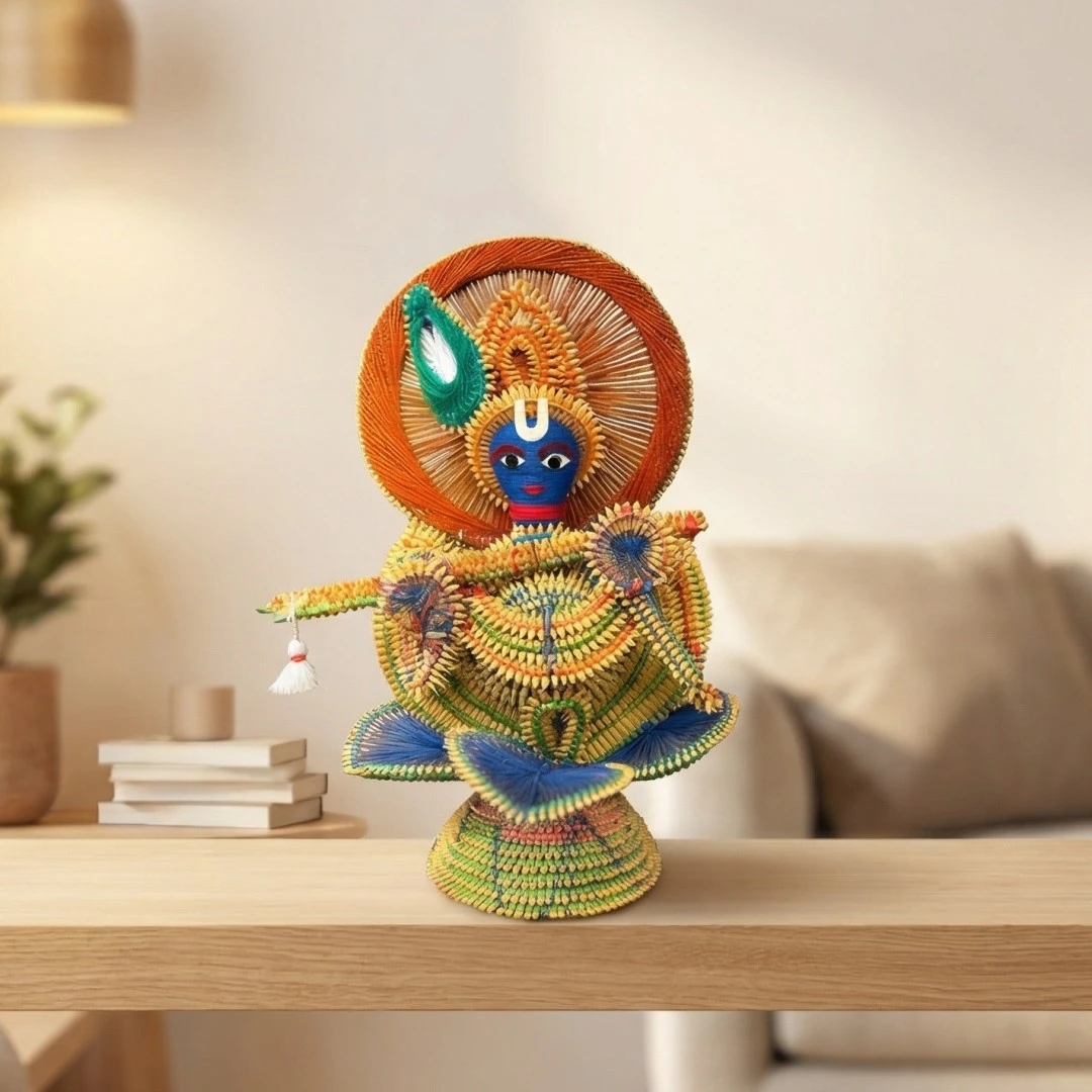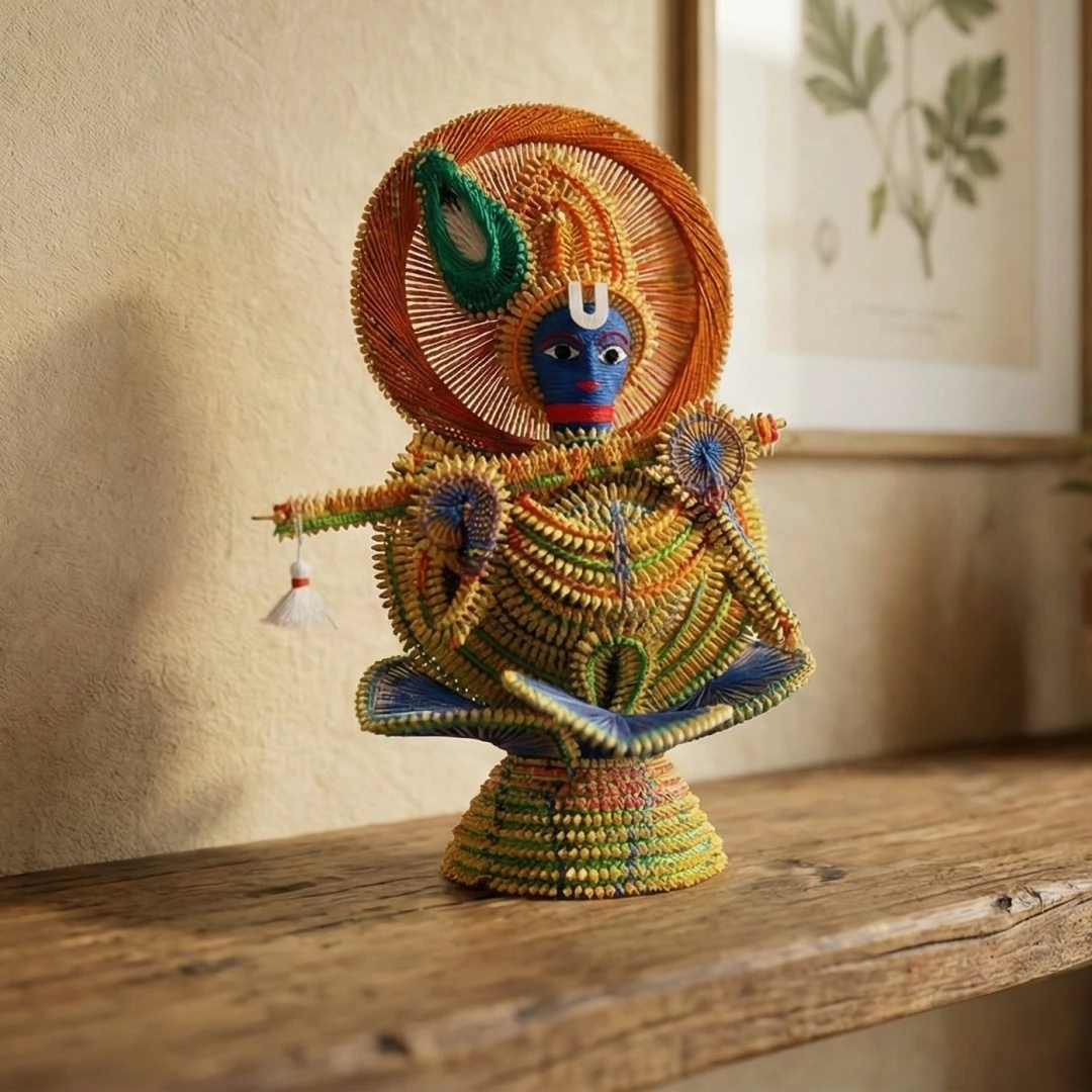 This Handmade Dhaana Craft Krishna Idol is a beautiful example of Indian folk artistry, crafted meticulously using natural paddy (rice grains) and traditional handwork techniques. The idol is inspired by Lord Krishna, symbolizing joy, devotion, and divine energy.