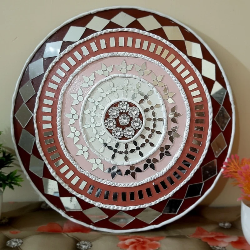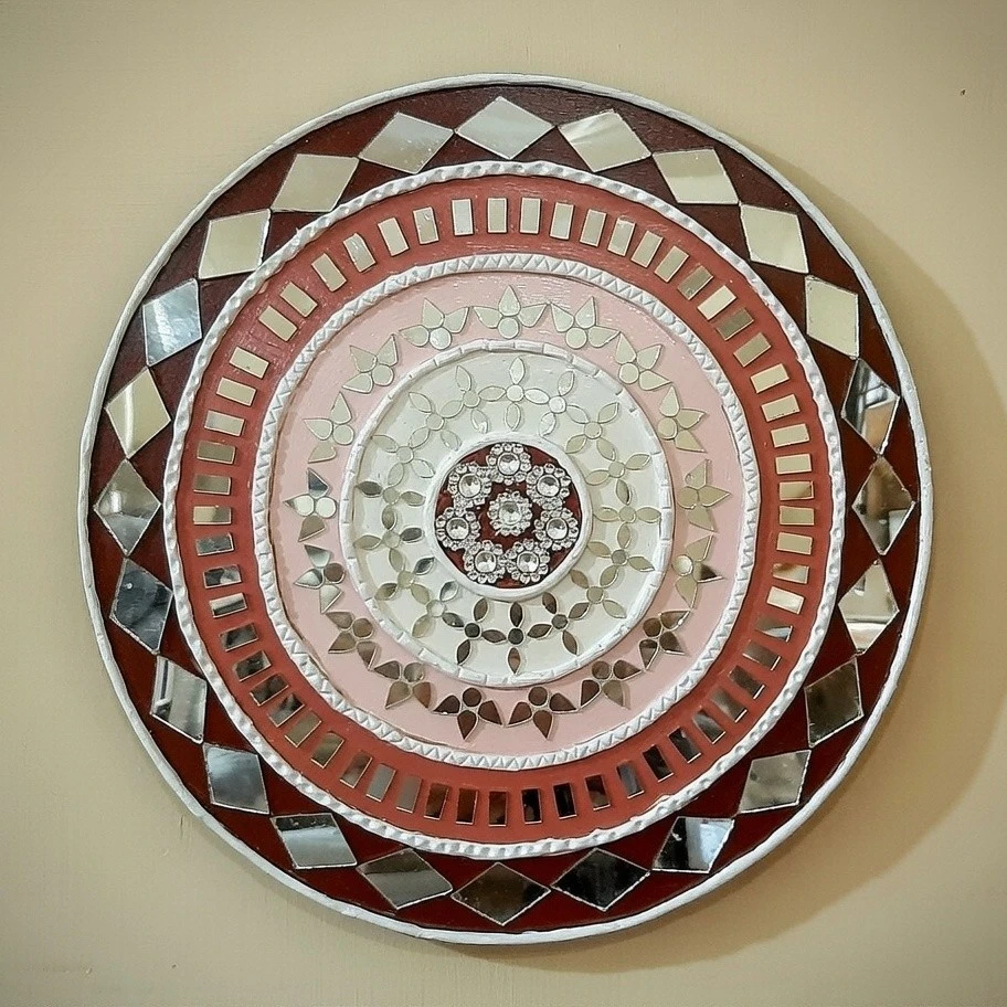 The circular mandala design features layered geometric and floral motifs that create depth and balance. Subtle mirror elements reflect light beautifully without overpowering the soft color palette, making this piece perfect for modern, boho, or ethnic interiors.