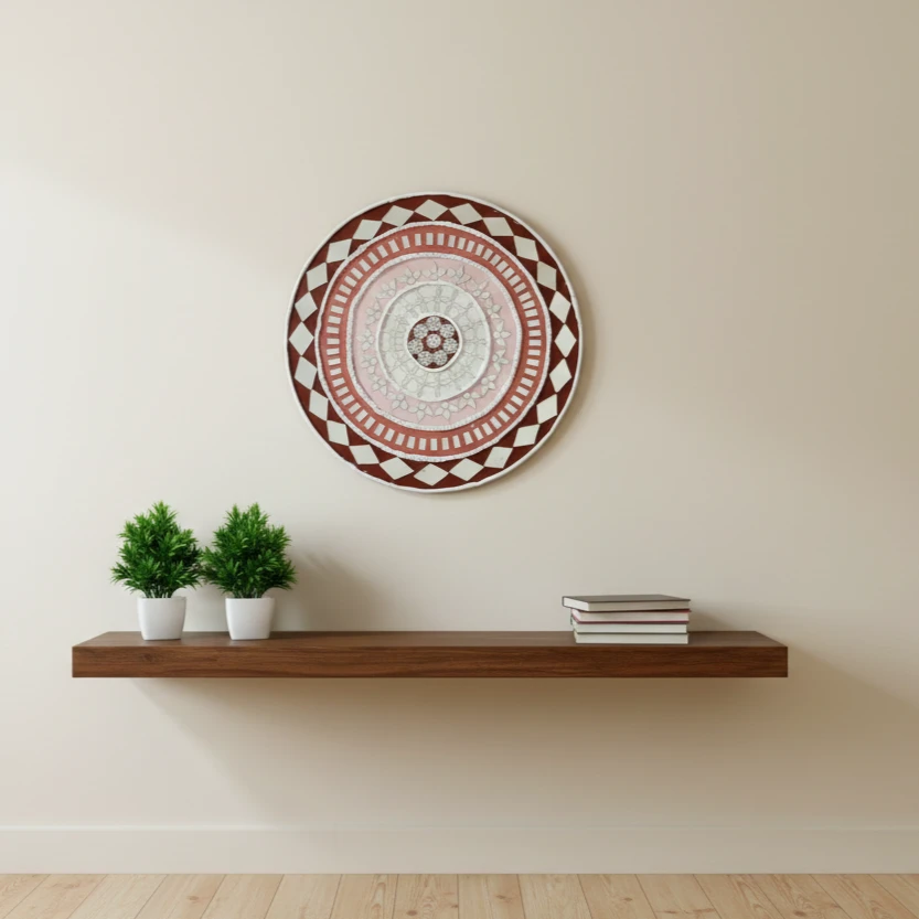 This elegant 12-inch handcrafted Lippan art wall décor is created on a sturdy MDF base and inspired by the traditional mud-mirror art of Kutch, Gujarat. The artwork showcases a harmonious blend of terracotta, blush, and ivory hues, enhanced with intricate raised clay outlines and mirror inlay.