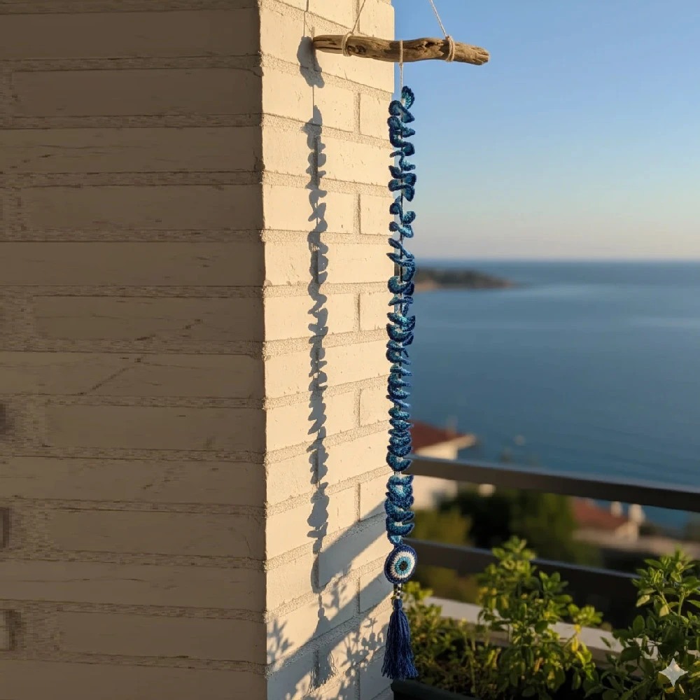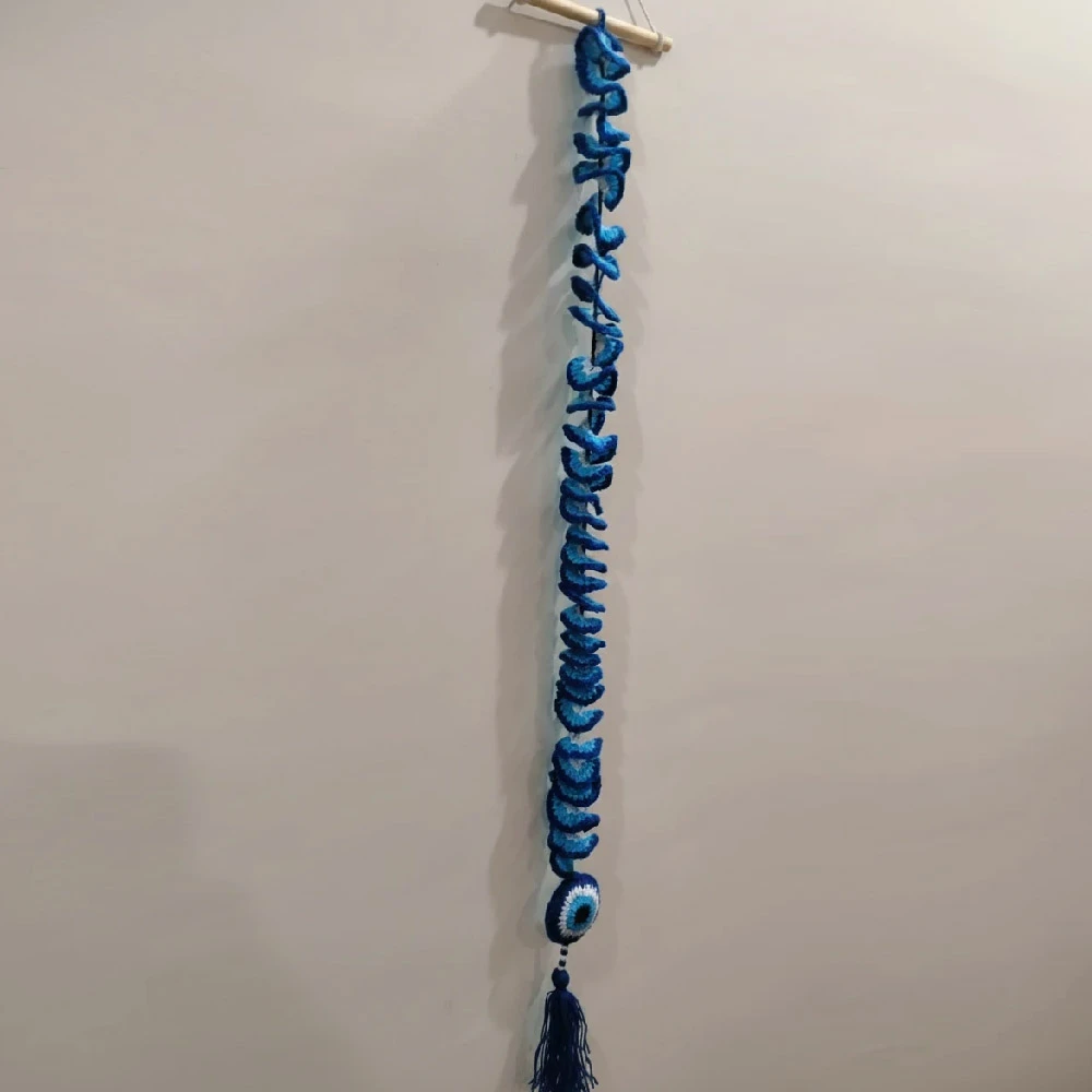 Design Aesthetics: Composed of a gracefully winding spiral in various shades of blue (from deep navy to light blue). The design culminates with a prominent Evil Eye (Nazar Battu) charm, intricately crocheted in white, black, and blue.