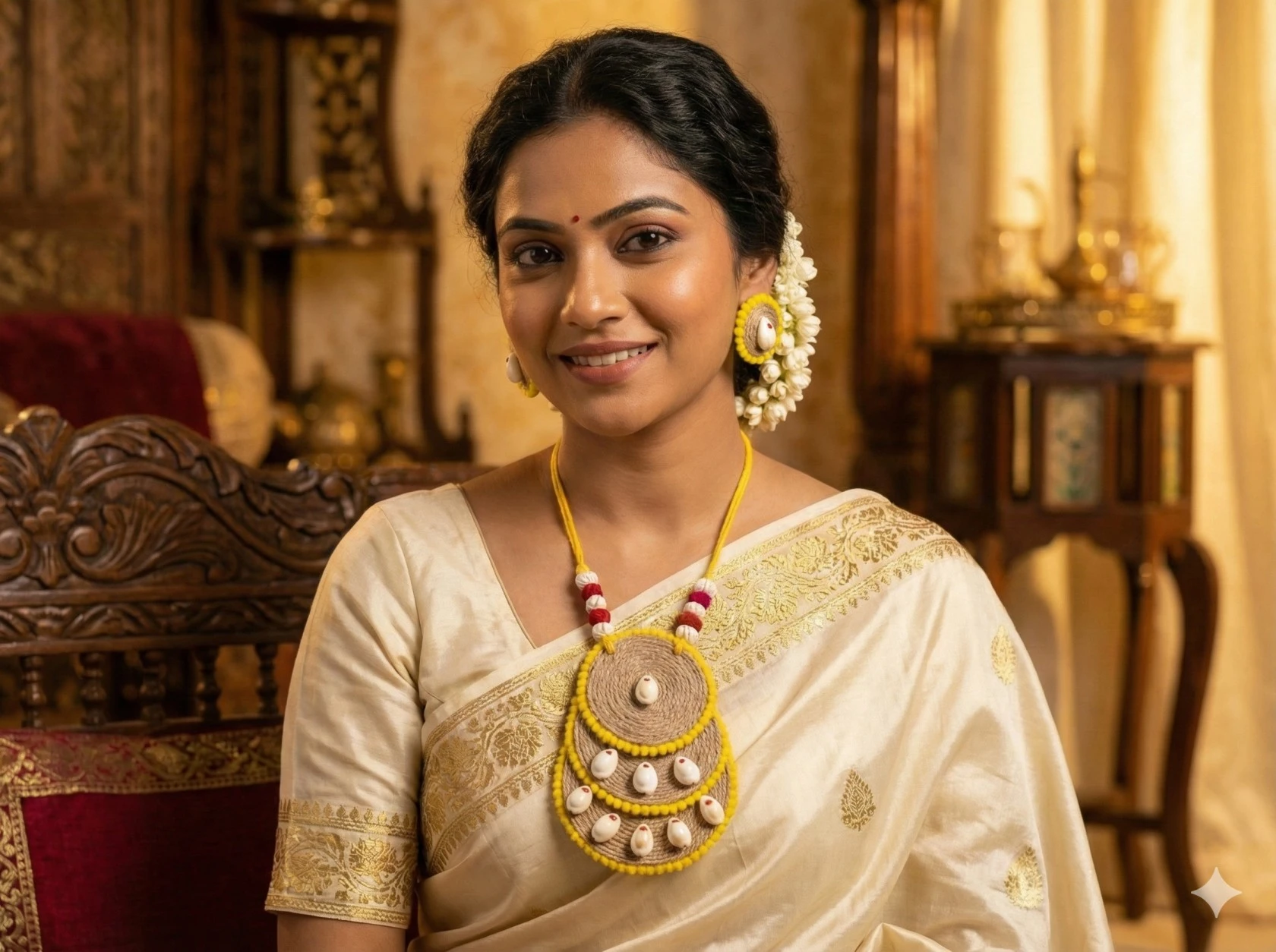 Embrace the beauty of raw materials with this exquisite Handcrafted Jute and Cowrie Shell Necklace Set. Expertly woven from natural jute twine, this set features a three-tier pendant design accentuated by a vibrant yellow threaded border. Each tier is adorned with natural white cowrie shells, adding a touch of coastal charm to the rustic base. The matching stud earrings complete the look, making this set a perfect accessory for cotton sarees, kurtas, or bohemian western wear.