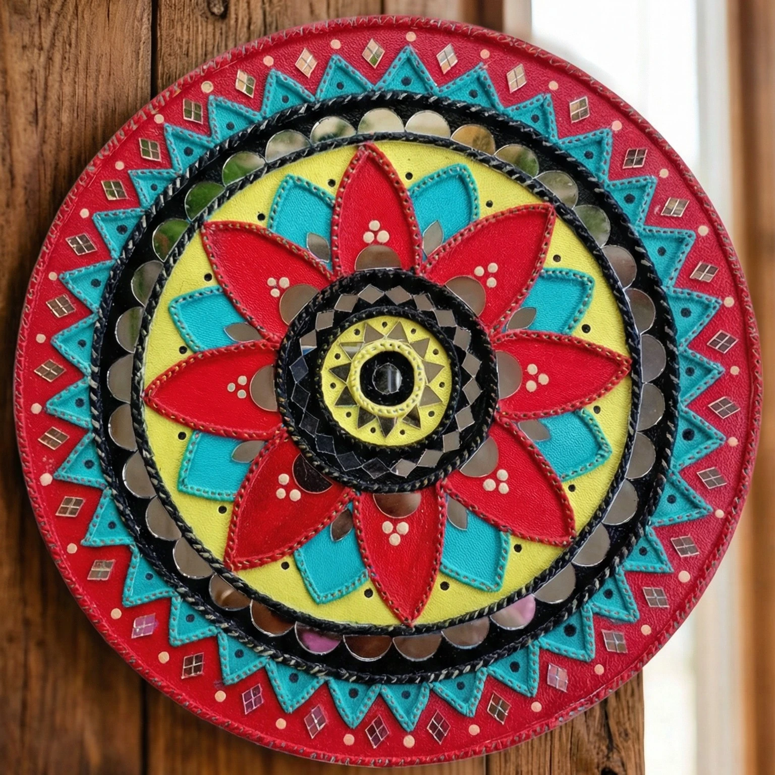The bold floral mandala at the center is surrounded by rhythmic geometric layers in red, turquoise, yellow, and black, symbolizing harmony and positivity. Each mirror element is carefully placed to reflect light beautifully, adding depth and vibrance to your walls.