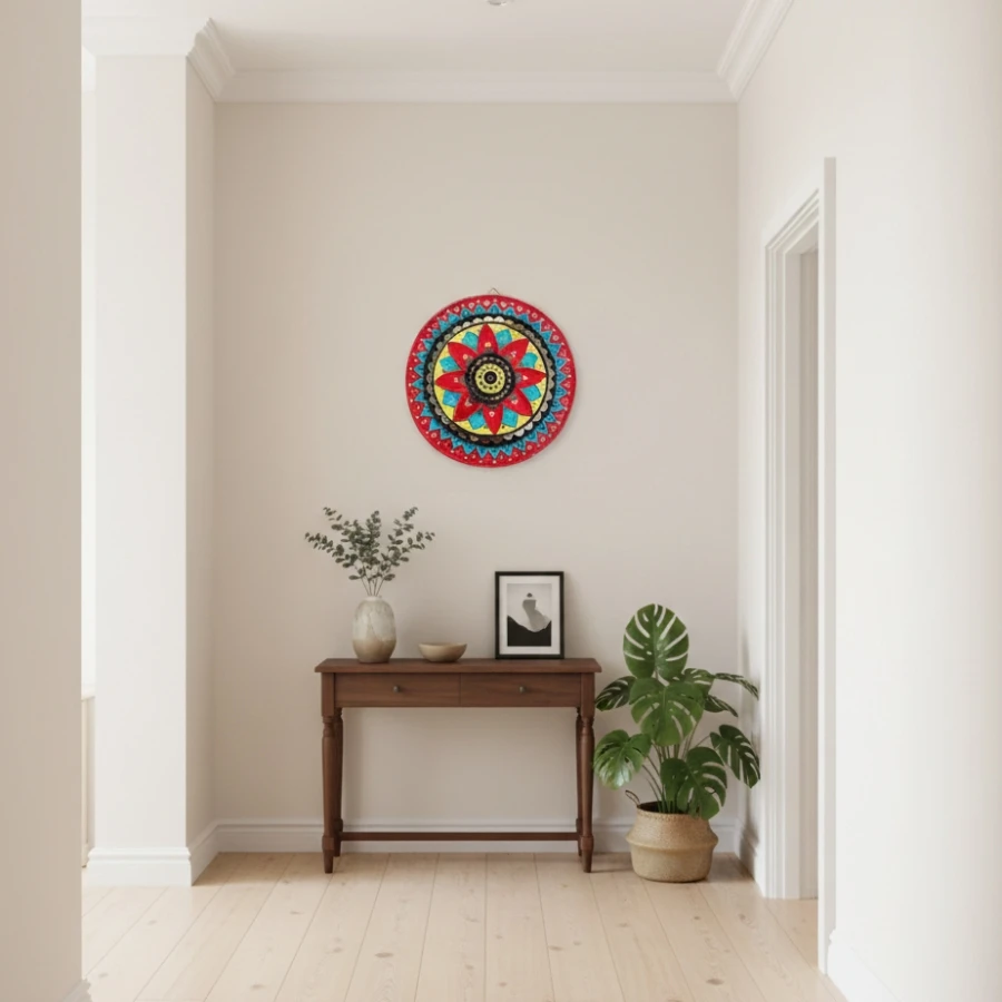 Celebrate colour, culture, and craftsmanship with this exquisite 12-inch handcrafted Lippan art wall décor. Created on a premium MDF base, this artwork reflects the soul of traditional Kutch folk art through intricate raised clay patterns, detailed mirror inlay, and rich hand-painted hues.