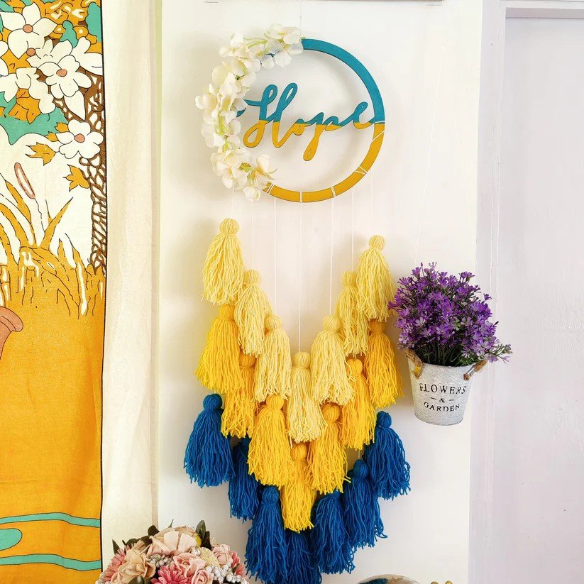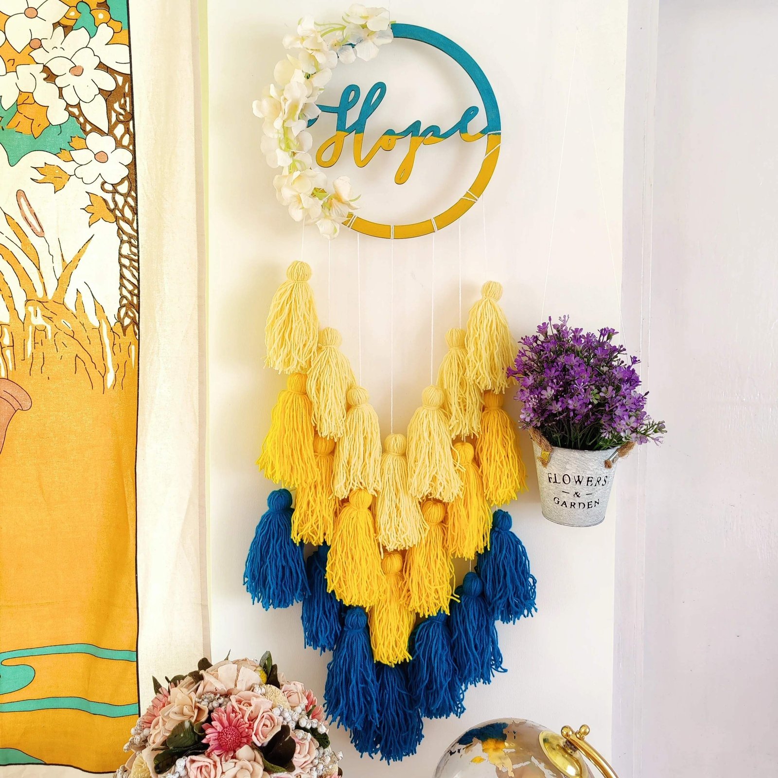 Infuse your space with positivity and charm through the Hope Tassle Dreamcatcher. Crafted with wool and MDF, this beautifully designed piece features a cascade of colorful tassels that brighten up any room. Perfect for home décor or as a thoughtful gift, it brings warmth, inspiration, and a playful boho vibe to your living space.