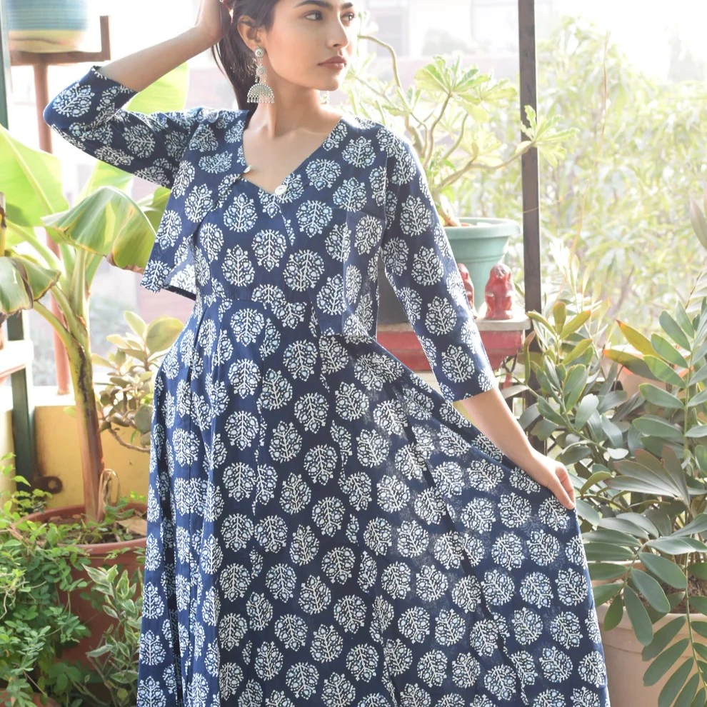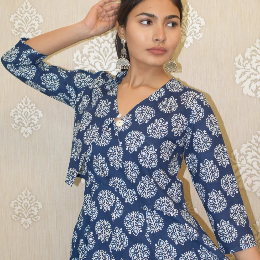 Features a rich indigo hue with “Amer Booti” (small floral motif) print design.