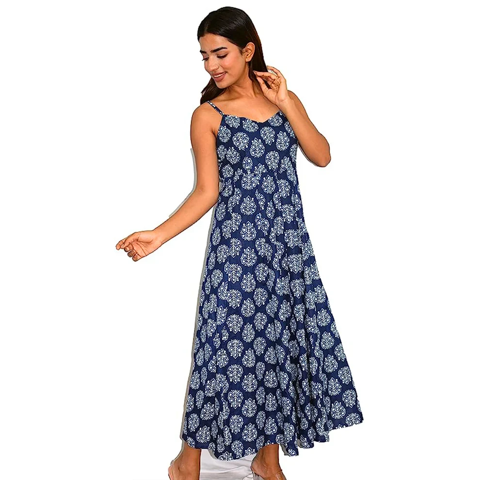 Elegant indigo colour base with a long flared silhouette for a graceful, flowing look.