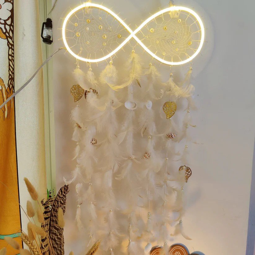 Illuminate your space with the ethereal charm of the Infinity Divine LED Dreamcatcher. Designed in calming white and ocean blue tones, this dreamcatcher combines soft feathers, delicate charms, and beads with gentle LED lighting to create a magical ambiance. Its versatile power options—cable or battery—allow you to display it anywhere, from bedrooms to living areas.