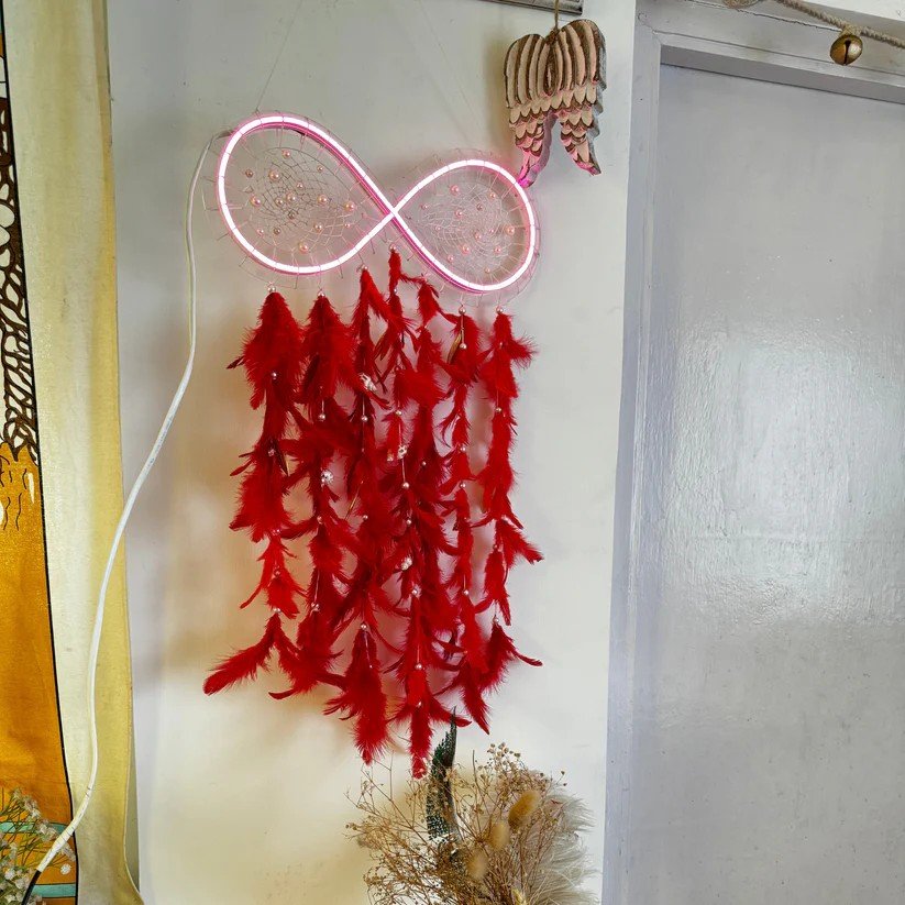 Light up your space with the Infinity Red LED Dreamcatcher, designed to bring warmth and vibrance to any room. Handcrafted with feathers, charms, beads, and glowing LED lights, it combines boho artistry with modern charm.