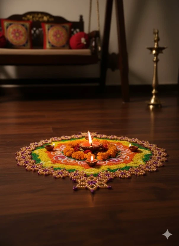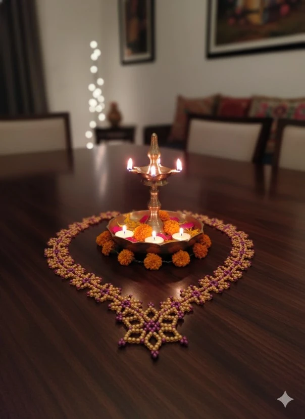 a substitute for traditional powder rangoli, often placed on tables or floors,