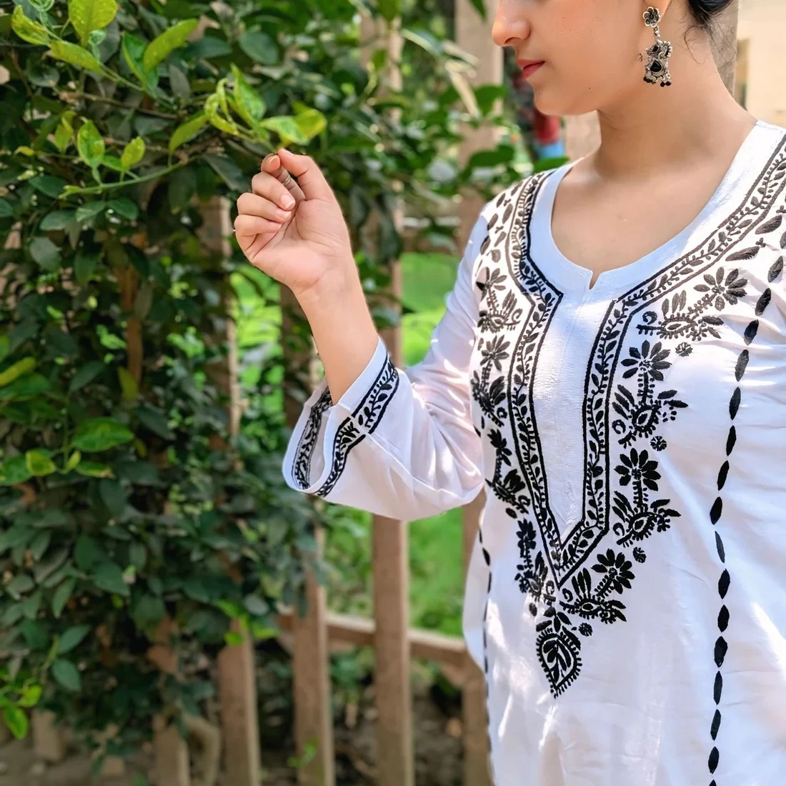 Accessorize with silver or oxidized earrings to highlight the embroidery