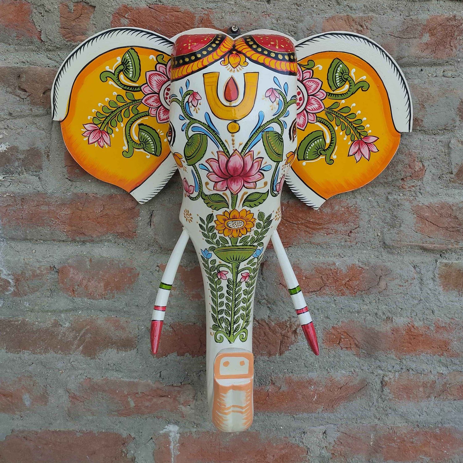 Enhance your walls with the KB ART Handcrafted Wooden Elephant Wall Decor, a stunning 14-inch piece inspired by the timeless beauty of Pattachitra folk art. Hand-carved from quality wood and meticulously handpainted by skilled artisans, this elephant head wall hanging features vibrant hues of orange, green, and red set against a rustic white backdrop.