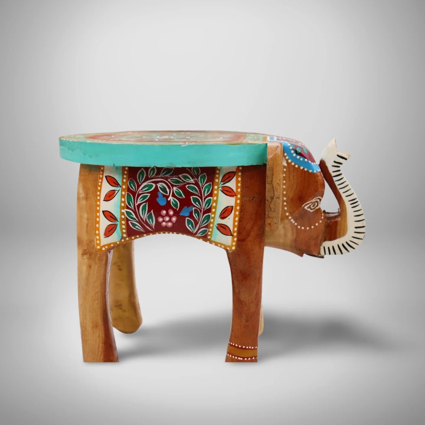 Expertly handcarved and handpainted by artisans, this stool features a charming elephant design decorated with multicolour floral motifs in red, turquoise, green, white, and yellow, finished with an antique polish for a timeless appeal. Compact yet versatile, it works perfectly as a decorative side stool, plant stand, pooja décor, accent table, or thoughtful gift.