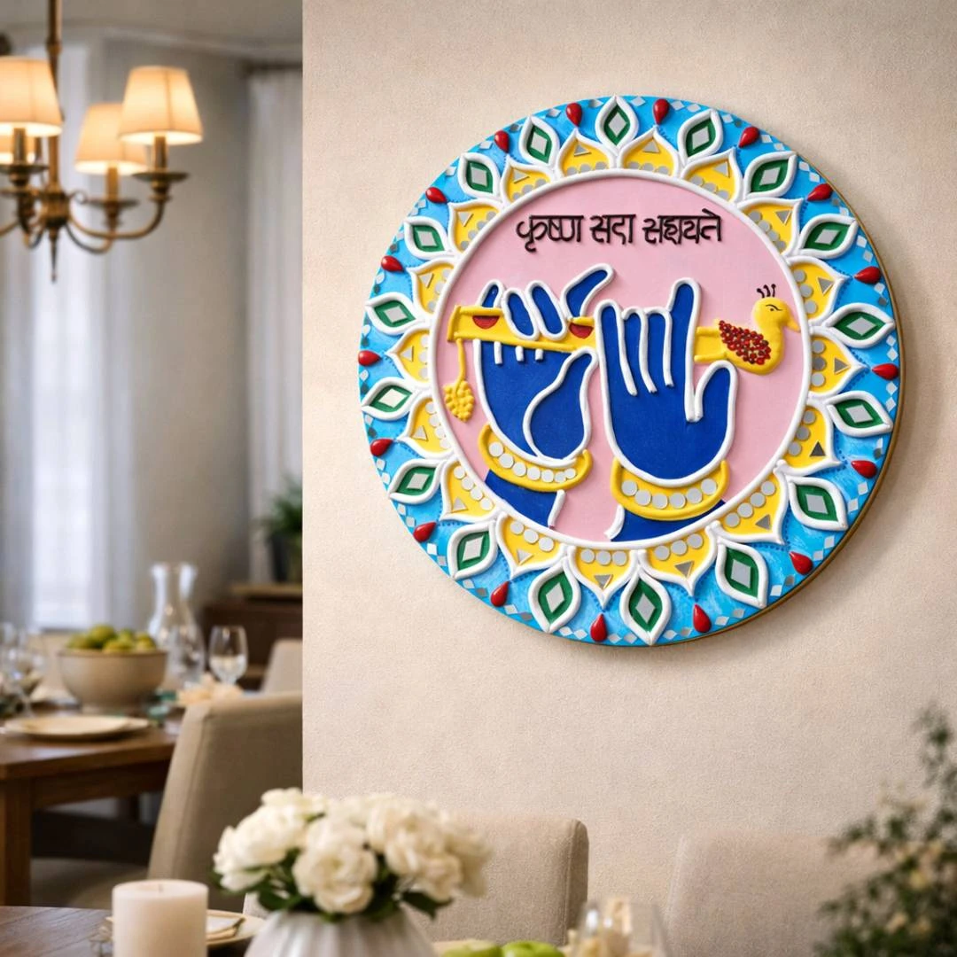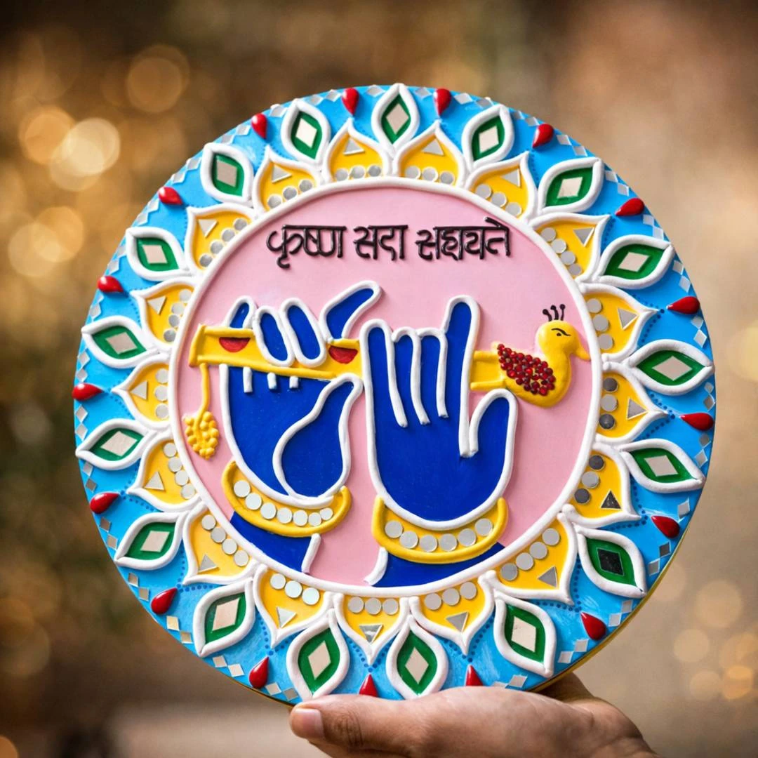 Bring divine positivity and traditional charm into your home with this beautiful Krishna Sada Sahayate – Handcrafted Lippan Art Wall Plate. Inspired by the rich heritage of Kutch Lippan Kaam, this artwork is meticulously handcrafted using clay, mirror embellishments, and vibrant colours.