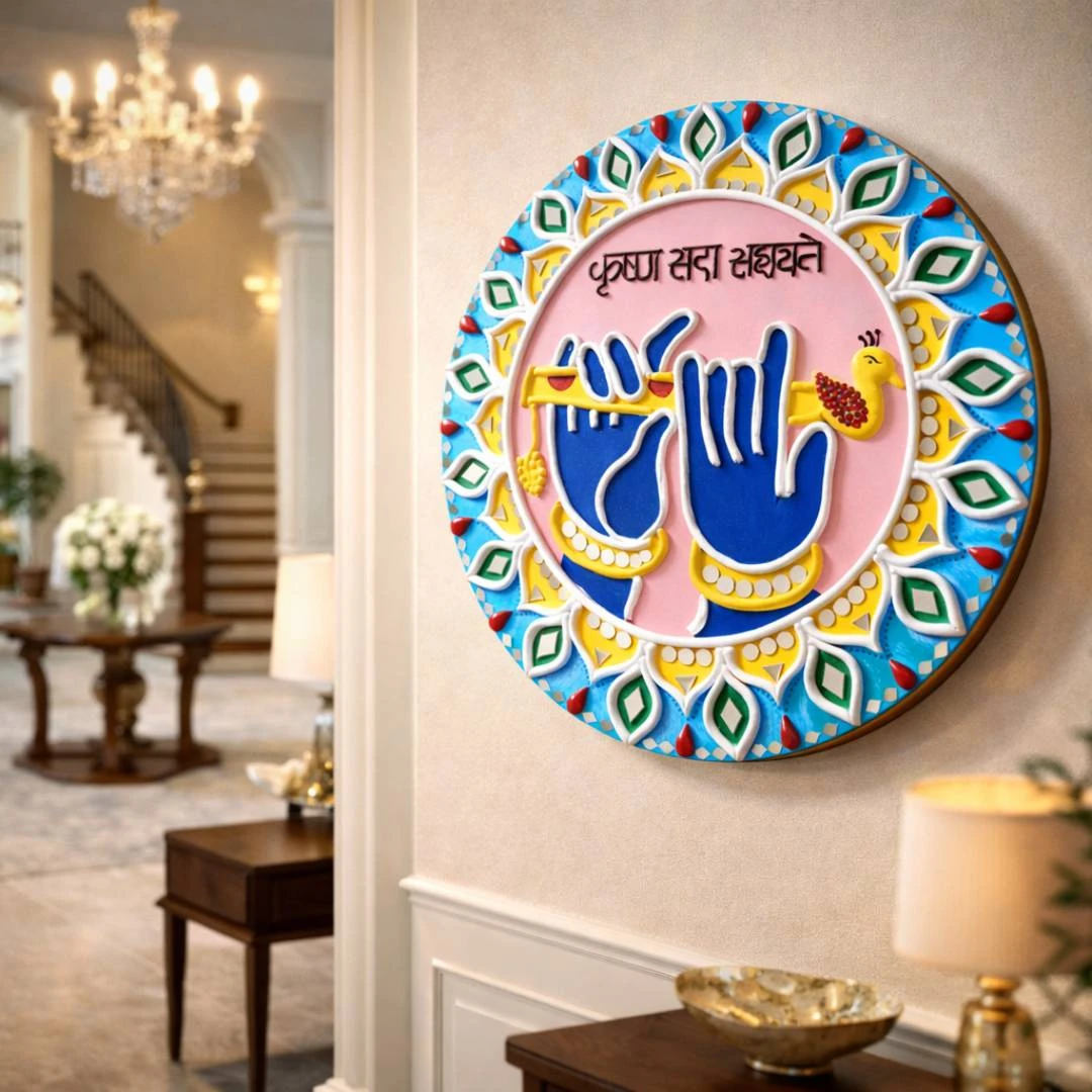 The artwork depicts Krishna’s divine blessings, symbolizing protection, peace, and eternal guidance. It serves as a meaningful wall décor for living rooms, temples, meditation corners, entrances, gifting occasions, and auspicious celebrations.