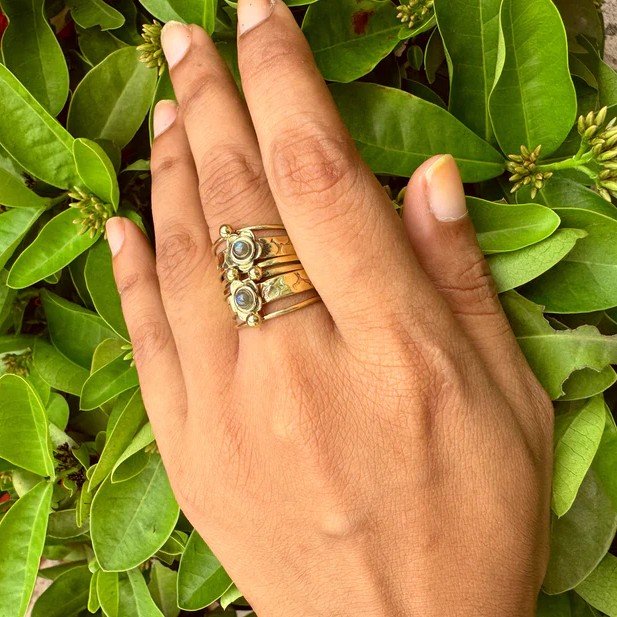 Experience the transformative power of our Labradorite Stackable Ring, handcrafted from pure brass and adorned with a mesmerizing labradorite crystal. Known as the stone of transformation, labradorite is believed to awaken intuition, strengthen inner resolve, and protect your aura.